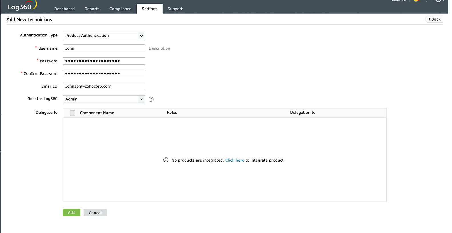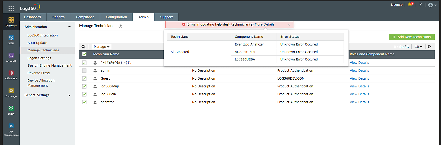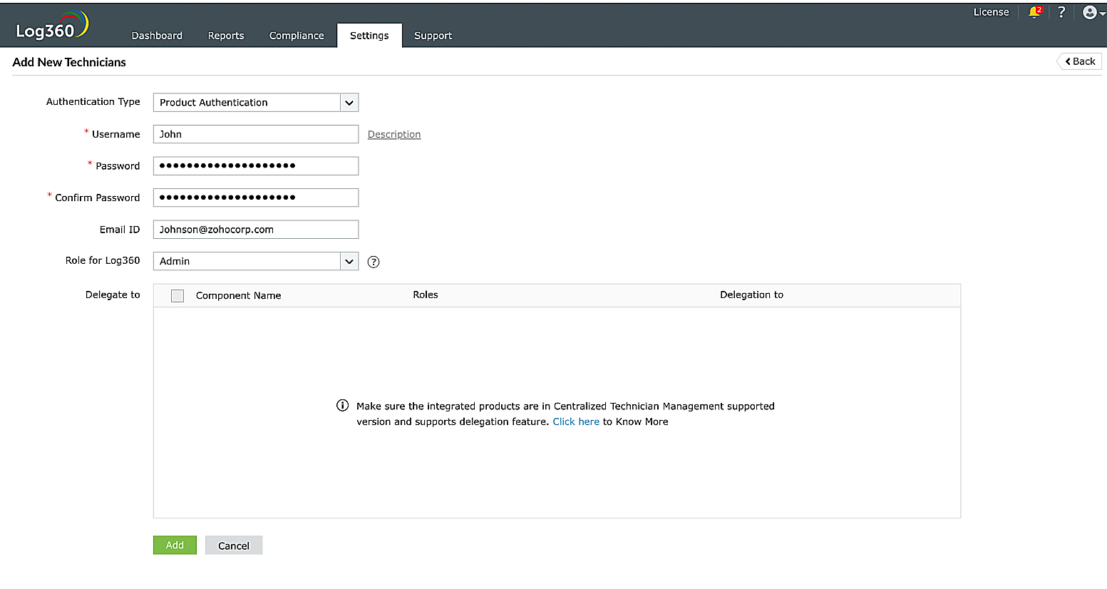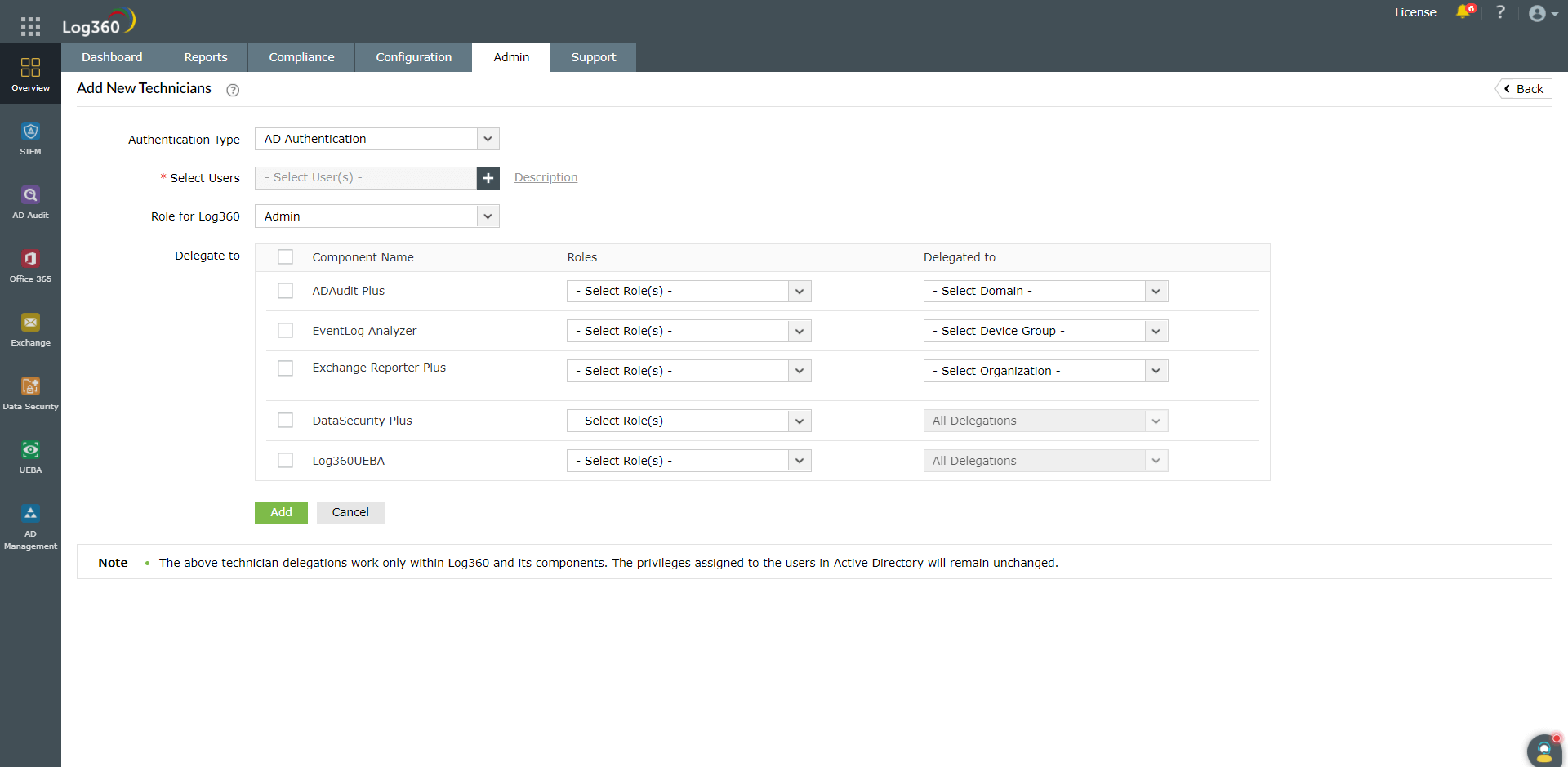 各コンポーネント製品にも、技術者の管理機能がありますが、Log360の技術者機能を使用して技術者を一元管理することを推奨します。一元化されたダッシュボードから確認することで、各コンポーネント製品における各技術者の役割をより明確に把握できるためです。