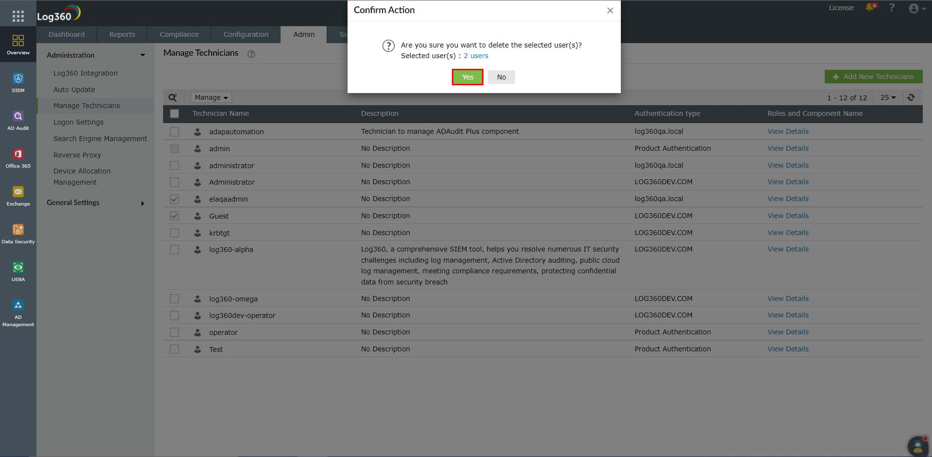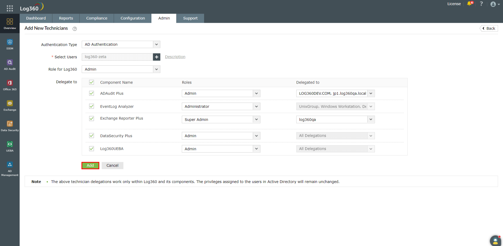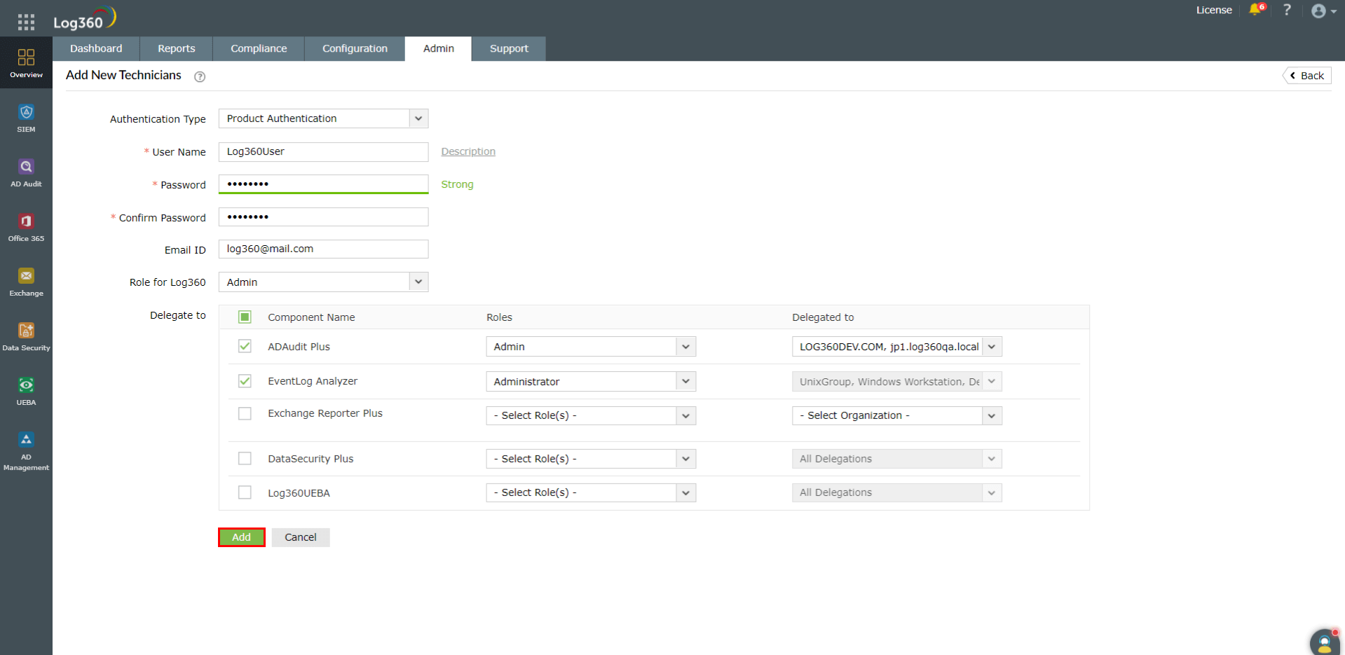 注記:コンポーネント製品から非ドメイン技術者を追加してもLog360とは同期されません。非ドメイン技術者は、Log360の技術者管理画面から追加してください。