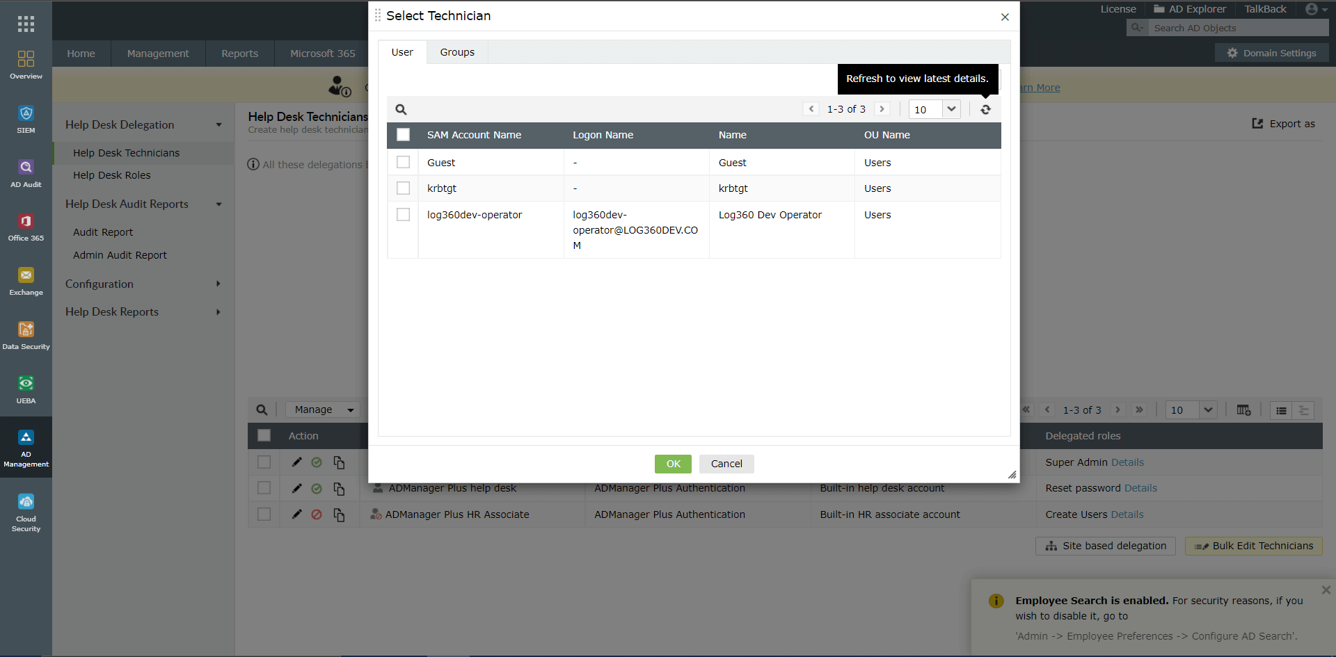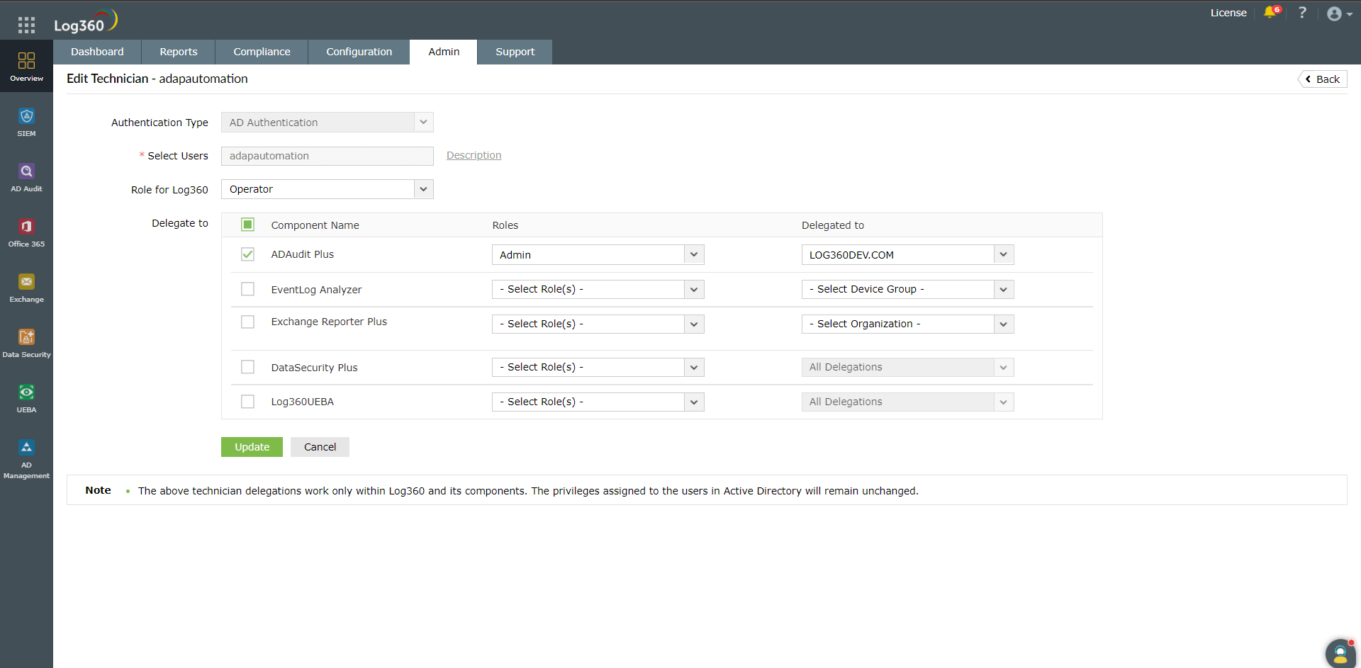 ドメイン技術者はLog360と同期されます。ユーザーはLog360のオペレーター権限も付与されます。 M365 Manager Plusの場合、Log360にバンドルされているライセンスの期間中に利用可能な既存の技術者には、バンドルされているロールである「Operator Extended」が付与されます。単体ライセンスを購入すると、既存ユーザーのロールを変更できます。 |