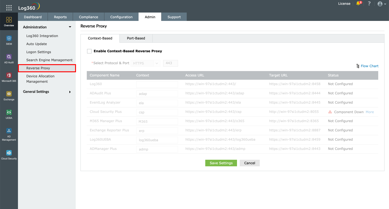 Log360を使用すると、コンテキストベースのリバースプロキシ、ポートベースのリバースプロキシ、またはその両方を有効にできます。
