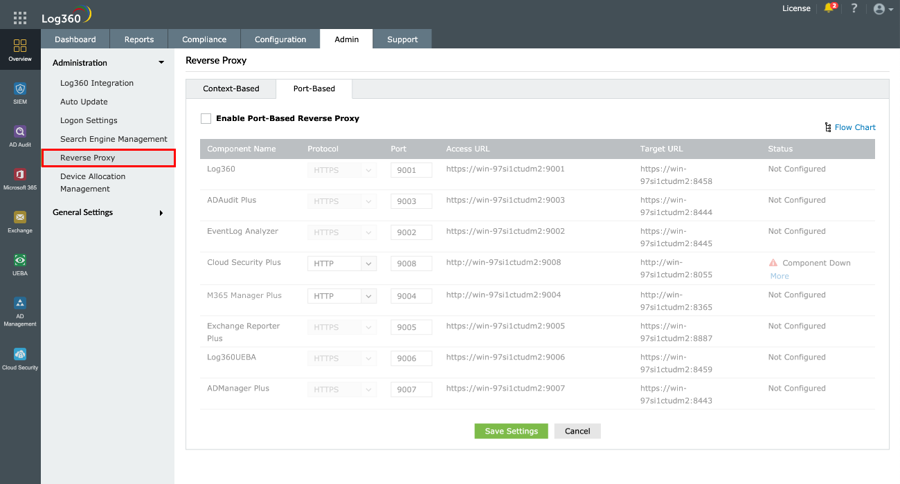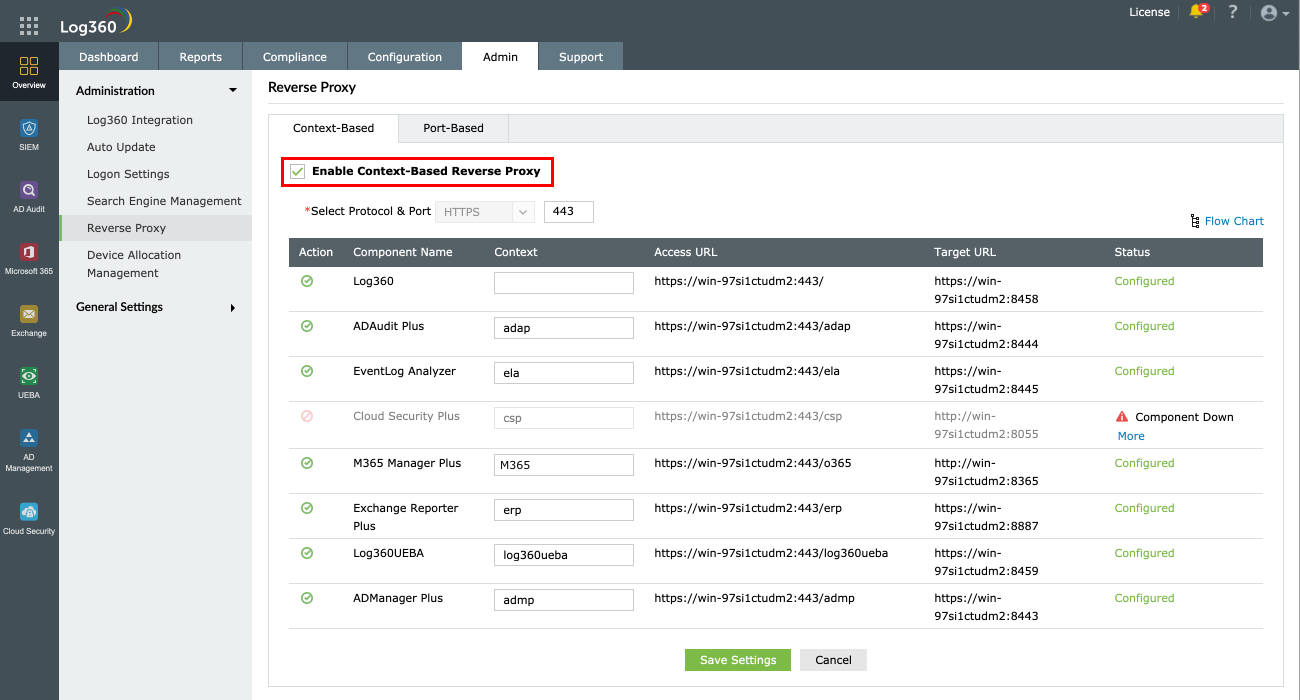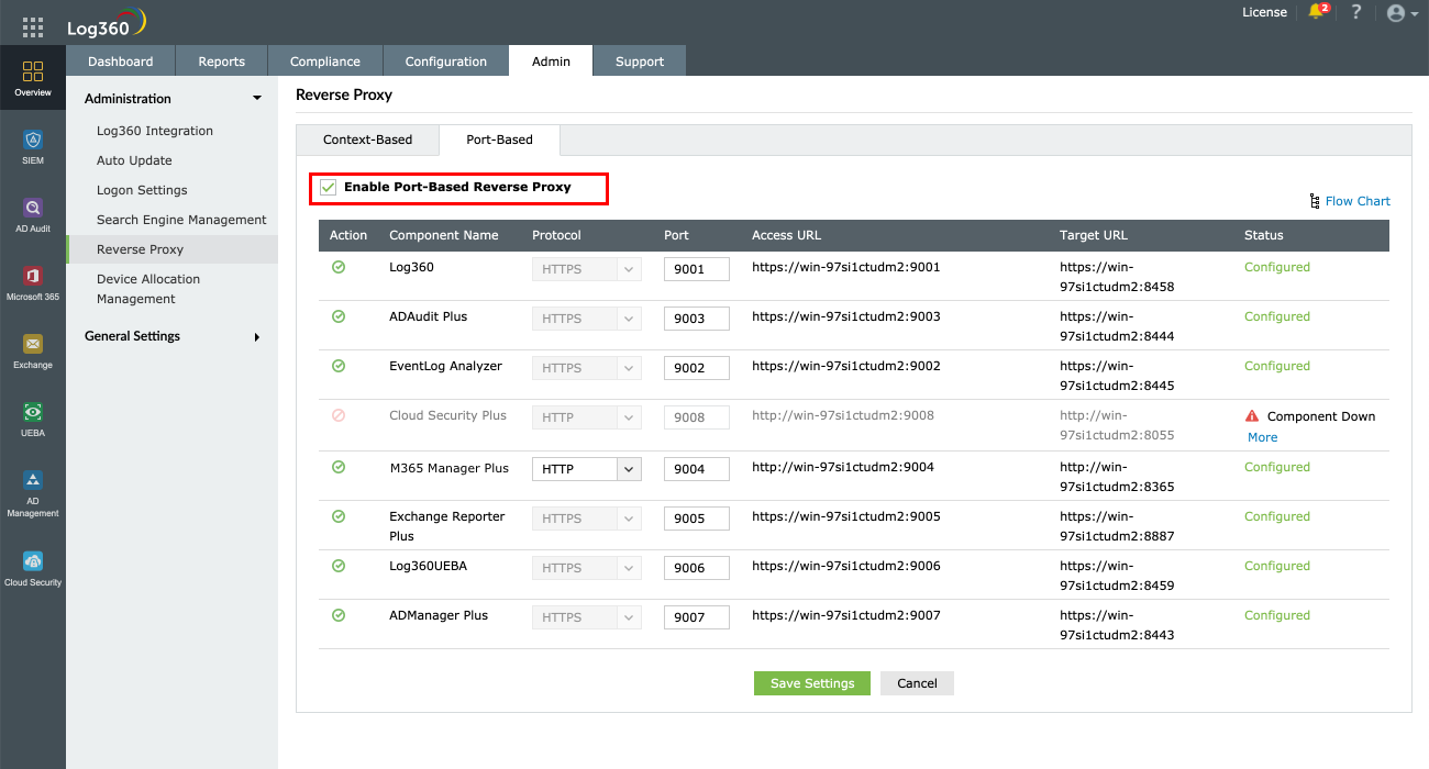 注記:リバースプロキシが有効化されている場合、Log360サーバーのホスト名はコンポーネント製品のサーバーのホスト名として機能します。