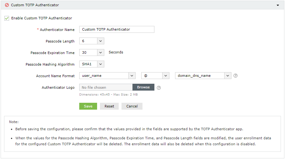 注記:パスコードハッシュアルゴリズム、パスコードの有効期限、パスコードの長さの値が変更された場合、設定されたカスタムTOTP認証のユーザー登録データが削除されます。設定が無効化された場合も、登録データは削除されます。