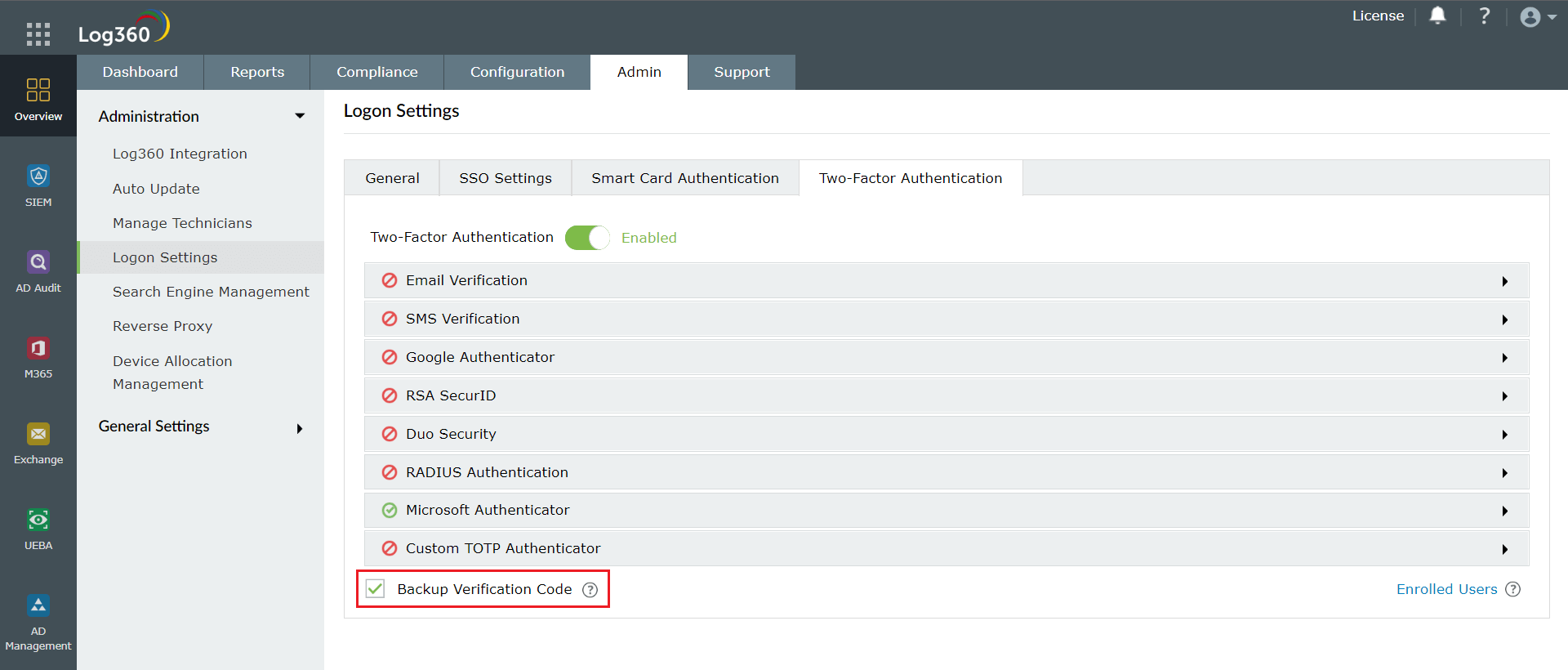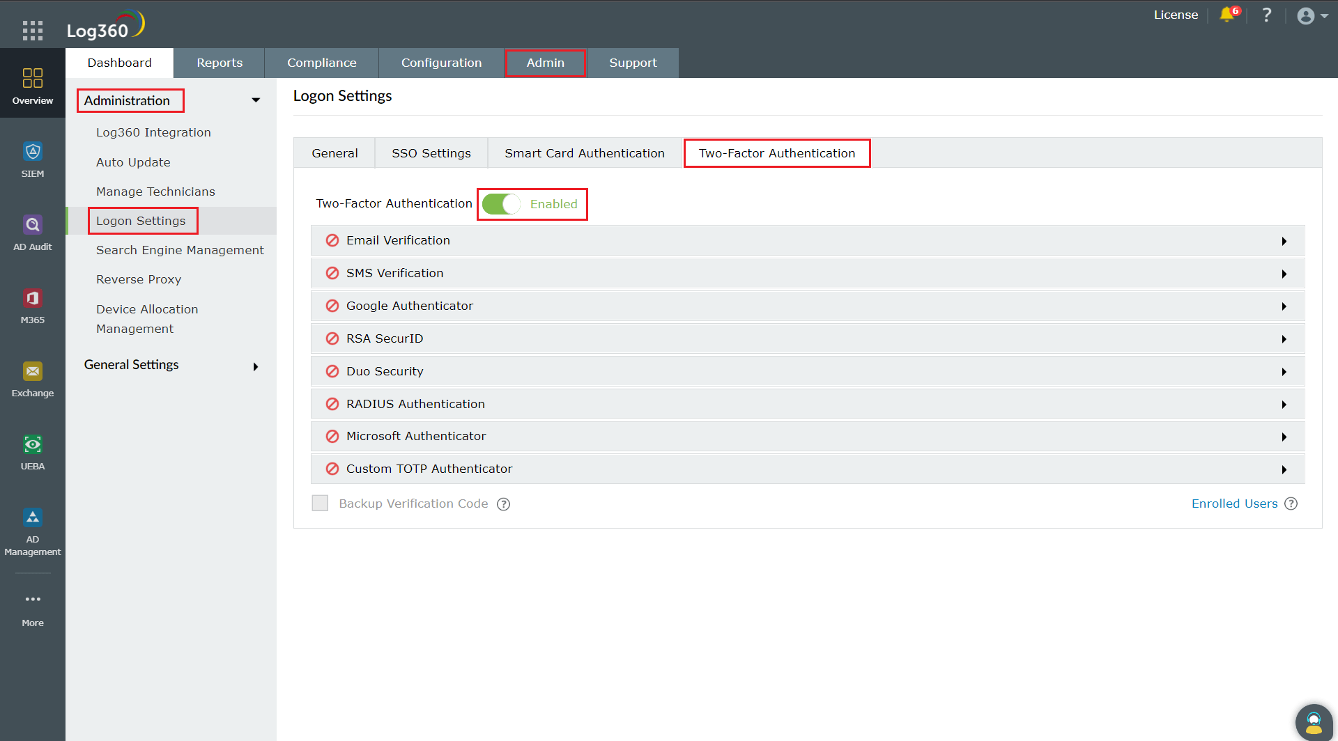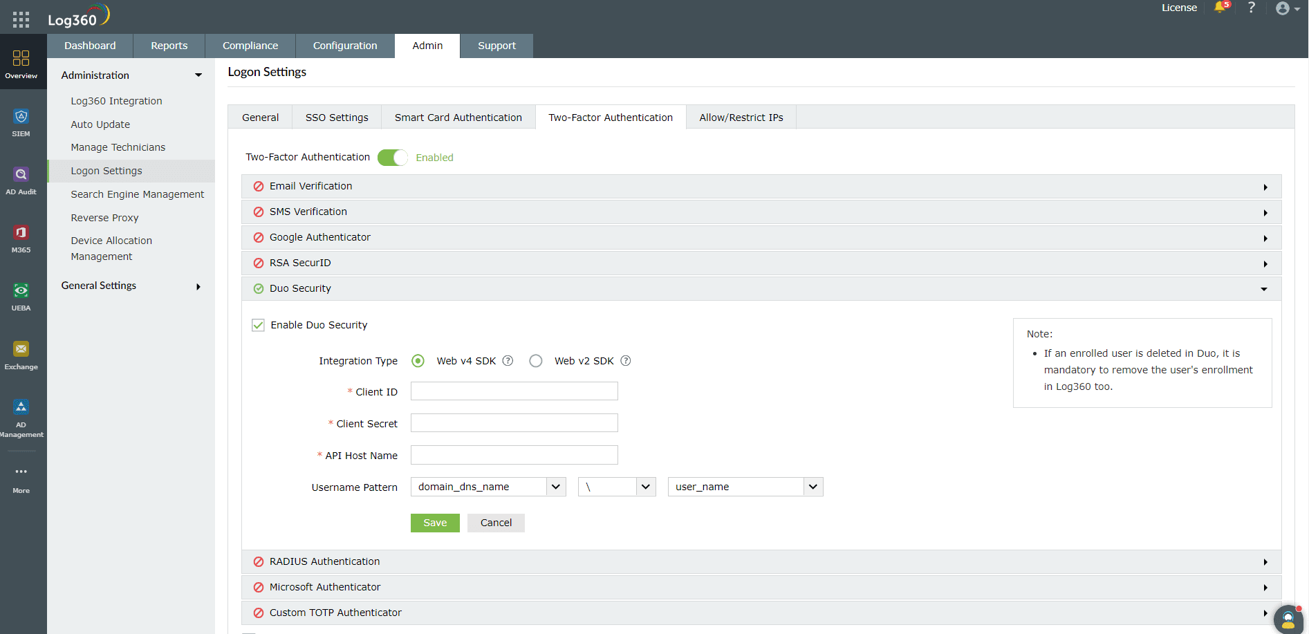 - Log360で、[管理]タブ → [管理] → [ログイン設定] → [二段階認証]タブ → [Duo Security]に移動します。