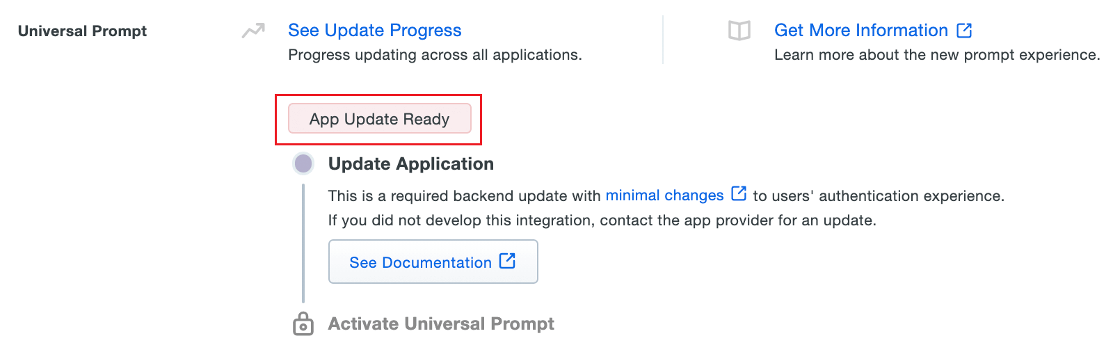 - [ユニバーサルプロンプト]セクションまでスクロールします。[App Update Ready]メッセージが表示され、Log360でユニバーサルプロンプトを有効化できるようになったことが示されます。