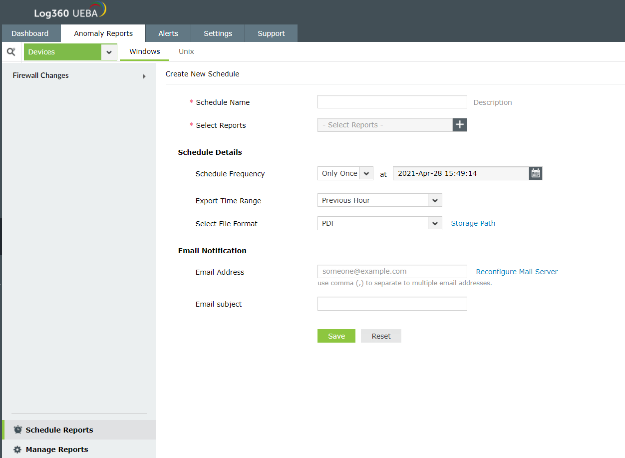 Log360 UEBAでは、任意の時間と間隔でレポートをスケジュール設定できます。スケジュール設定したレポートは、関係者に指定した時間間隔で自動的にメール送信できます。また、選択したストレージパスに保存することもできます。