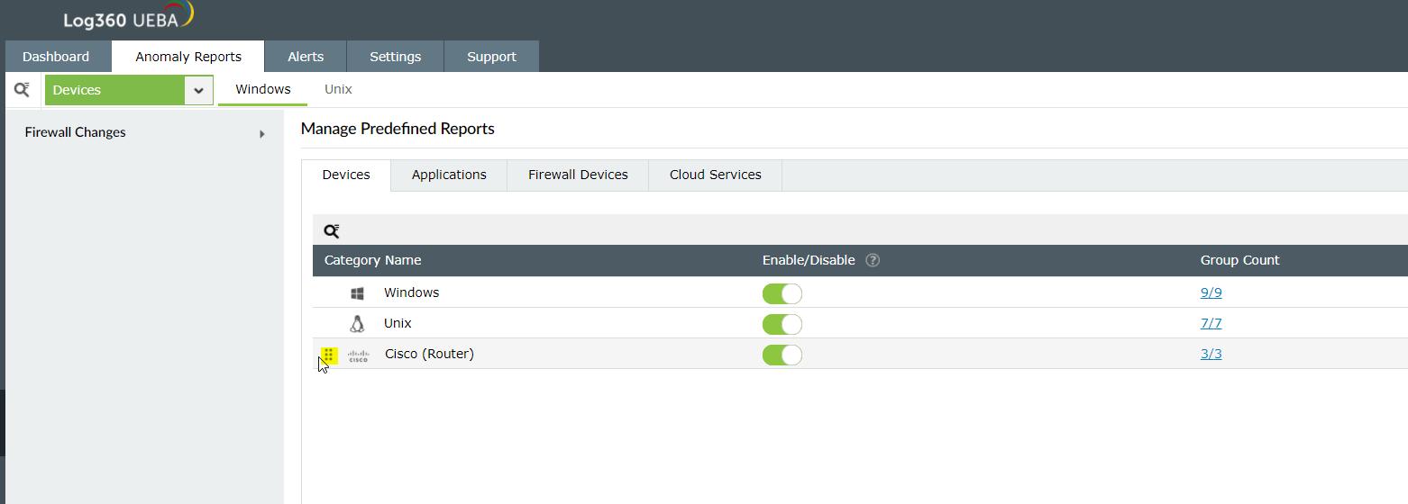 - デバイス、アプリケーション、ファイアウォールデバイス、クラウドサービス、またはカスタムレポートのタブを選択すると、選択した内容に基づいたレポートのカテゴリ名が表示されます。[異常レポート]タブ上でのカテゴリの表示/非表示を選択できるほか、[グループ数]列から各カテゴリのレポートグループ数を確認することもできます。