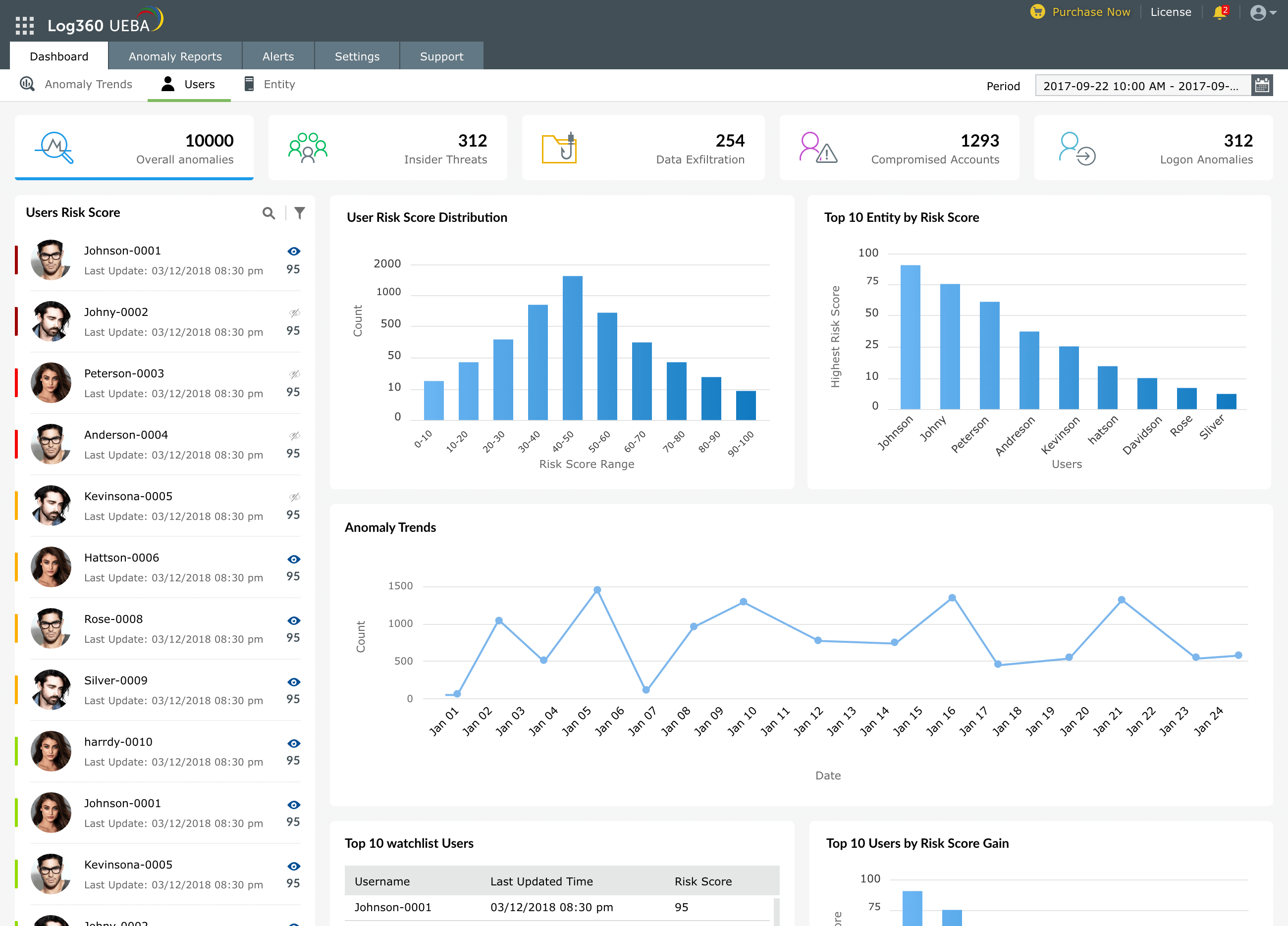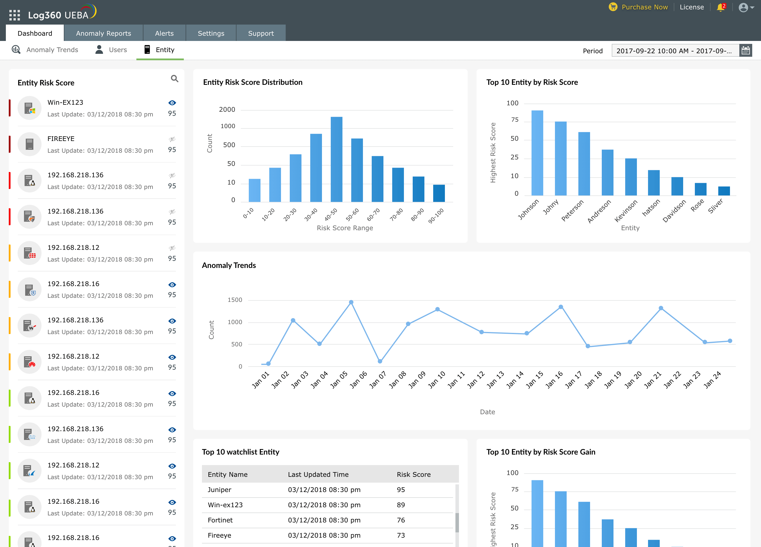 ダッシュボードは、ネットワーク内のユーザーとエンティティに基づいた異常な行動の概要を提供します。複数のデータソースを1つのインターフェイスに集約しているため、管理者は組織のセキュリティ体制のステータスをすばやく確認できます。
