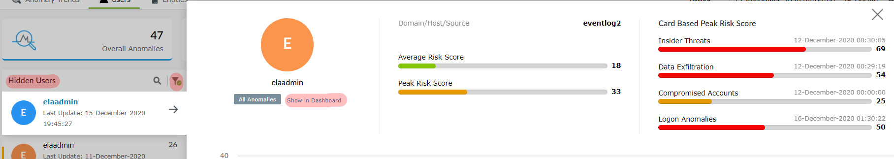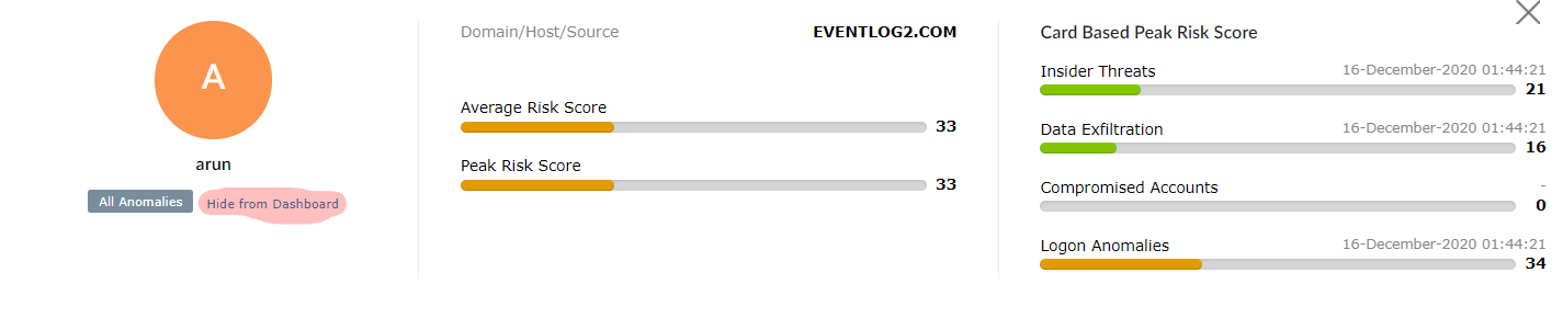 - 特定のユーザーまたはエンティティの詳細をダッシュボードに表示したくない場合は、[ダッシュボードから隠す]をクリックします。これにより、ダッシュボードからユーザーまたはエンティティの詳細が削除されます。ただし、ユーザーまたはエンティティの異常なアクティビティは、引き続き異常レポートで表示できます。