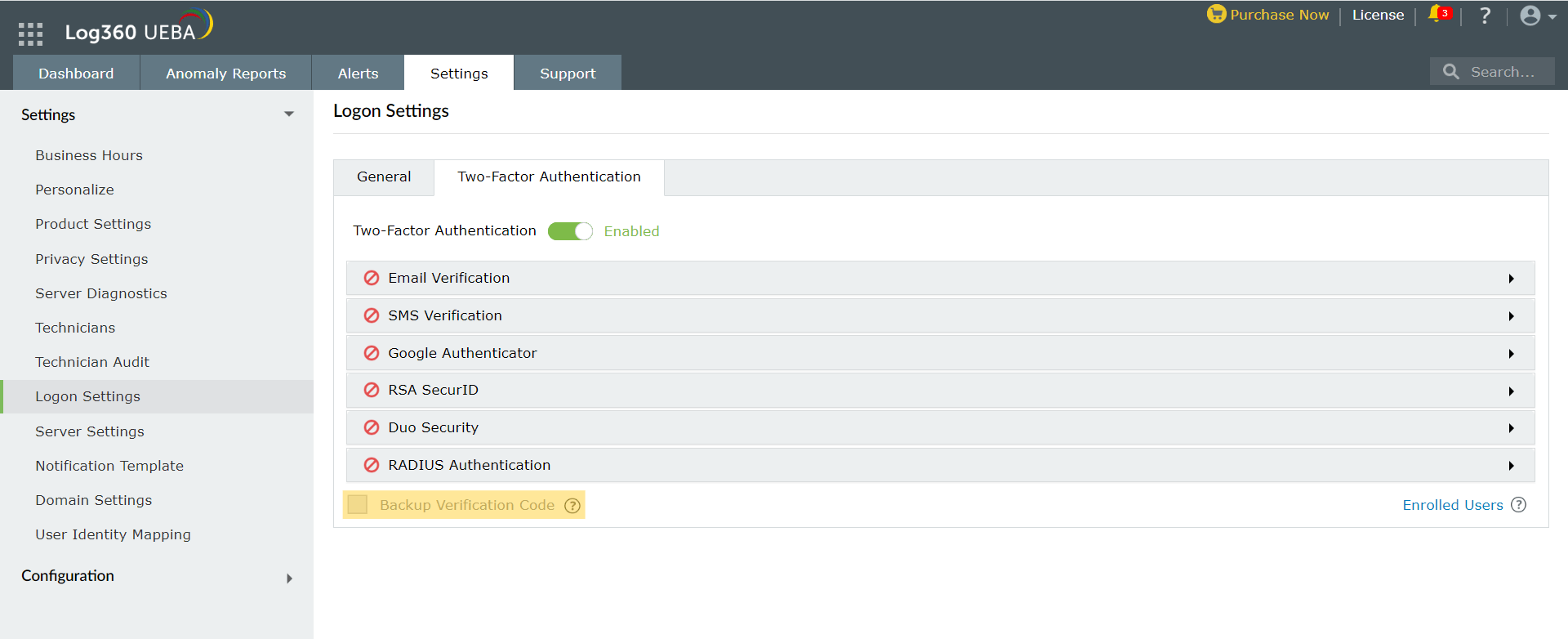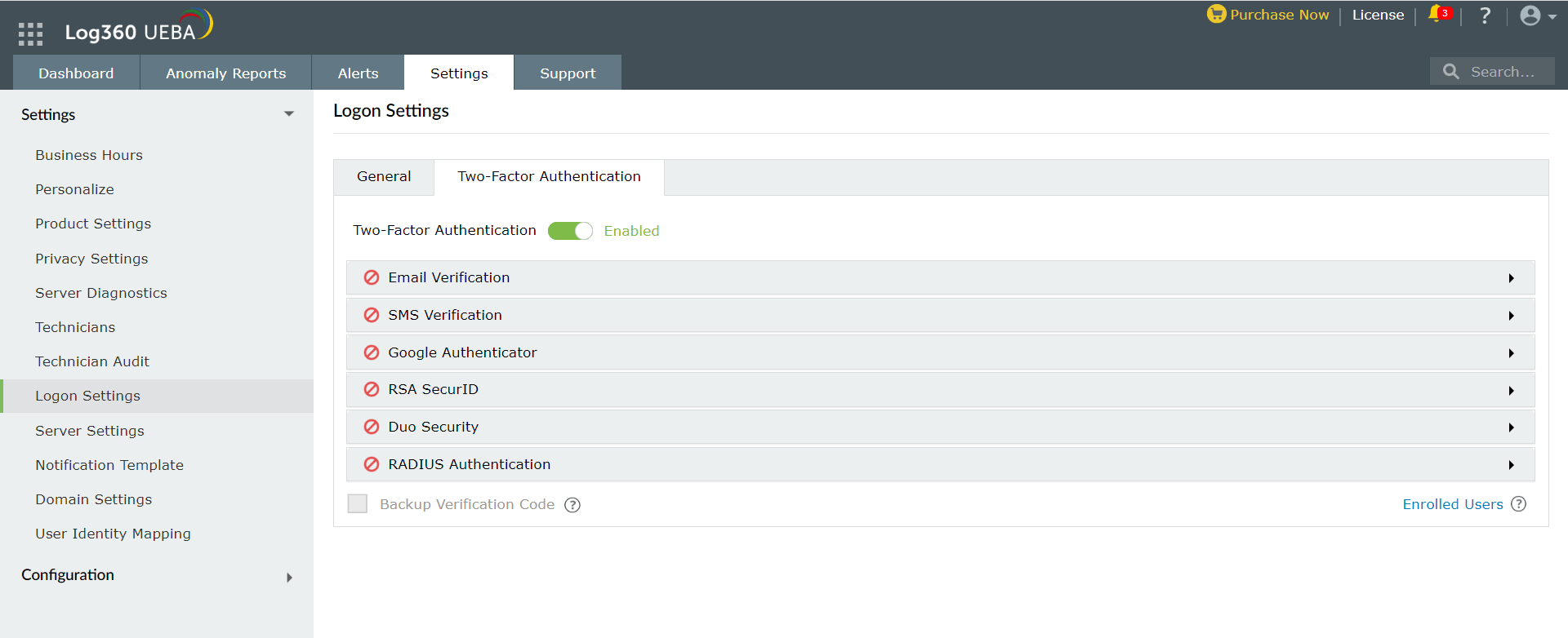 ユーザーログインのセキュリティを強化するために、Log360 UEBAは2要素認証をサポートしています。UEBAでは以下の2要素認証を使用できます。