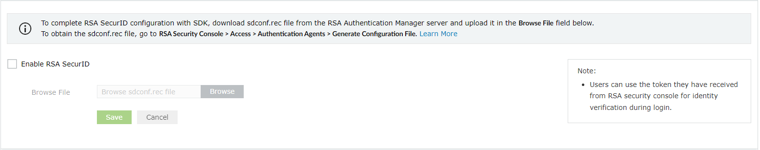 - Log360 UEBAにてRSA SecurIDを有効化後、[参照]をクリックして、「sdconf.rec」ファイルを選択します。