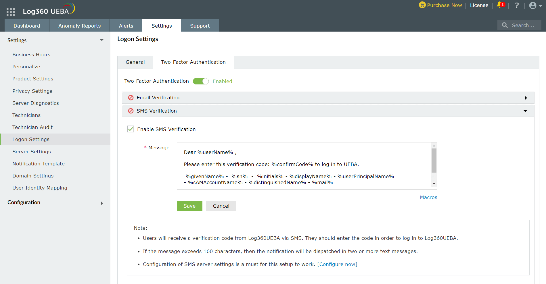 Log360 UEBAは確認コードをユーザーの電話番号にSMSで送信します。ユーザーが正常にログインするためには、確認コードを入力する必要があります。