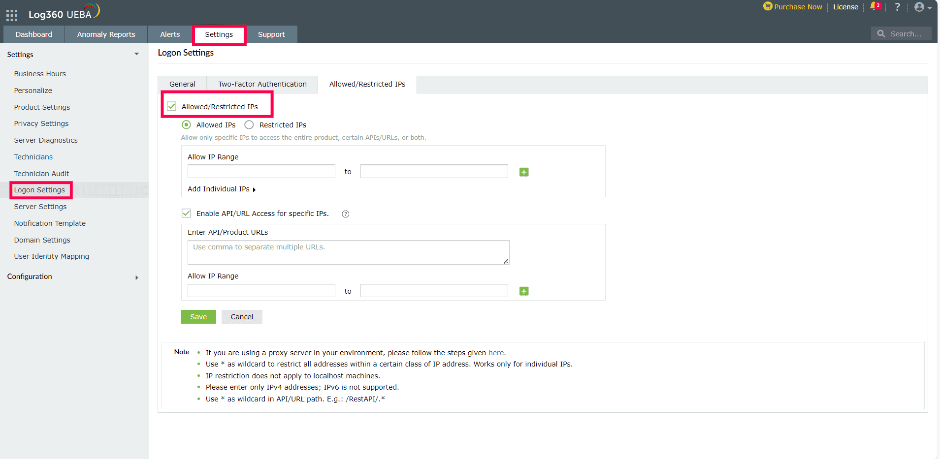 Log360 UEBAのセキュリティは、製品へのインバウンド接続リクエストを制限することで強化できます。本機能は、信頼できるIPアドレスとIPアドレス範囲からの接続のみを許可し、その他の不要で悪意のあるトラフィックをブロックするように設定できます。制限は、製品へのアクセスに使用されるAPIや、アクセスを制限する必要がある重要な製品内の特定のURLに適用できます。