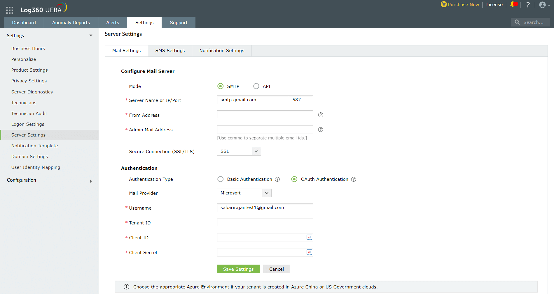 - メールプロバイダーがMicrosoftの場合は、ユーザー名、テナントID、クライアントID、クライアントシークレットを入力します。Log360 UEBAでは、Azure CloudがデフォルトのAzure環境とみなされます。[適切なAzure環境を選択してください]より、Azure環境の設定を変更できます。