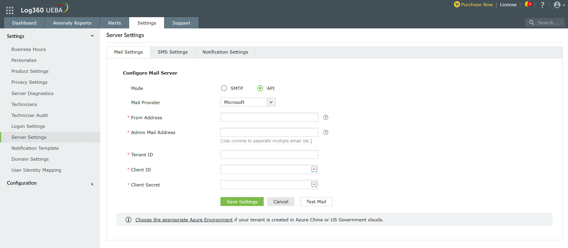 - メールプロバイダーがMicrosoftの場合は、テナントID、クライアントID、クライアントシークレットを入力します。Log360 UEBAでは、Azure CloudがデフォルトのAzure環境とみなされます。[適切なAzure環境を選択してください]より、Azure環境の設定を変更できます。