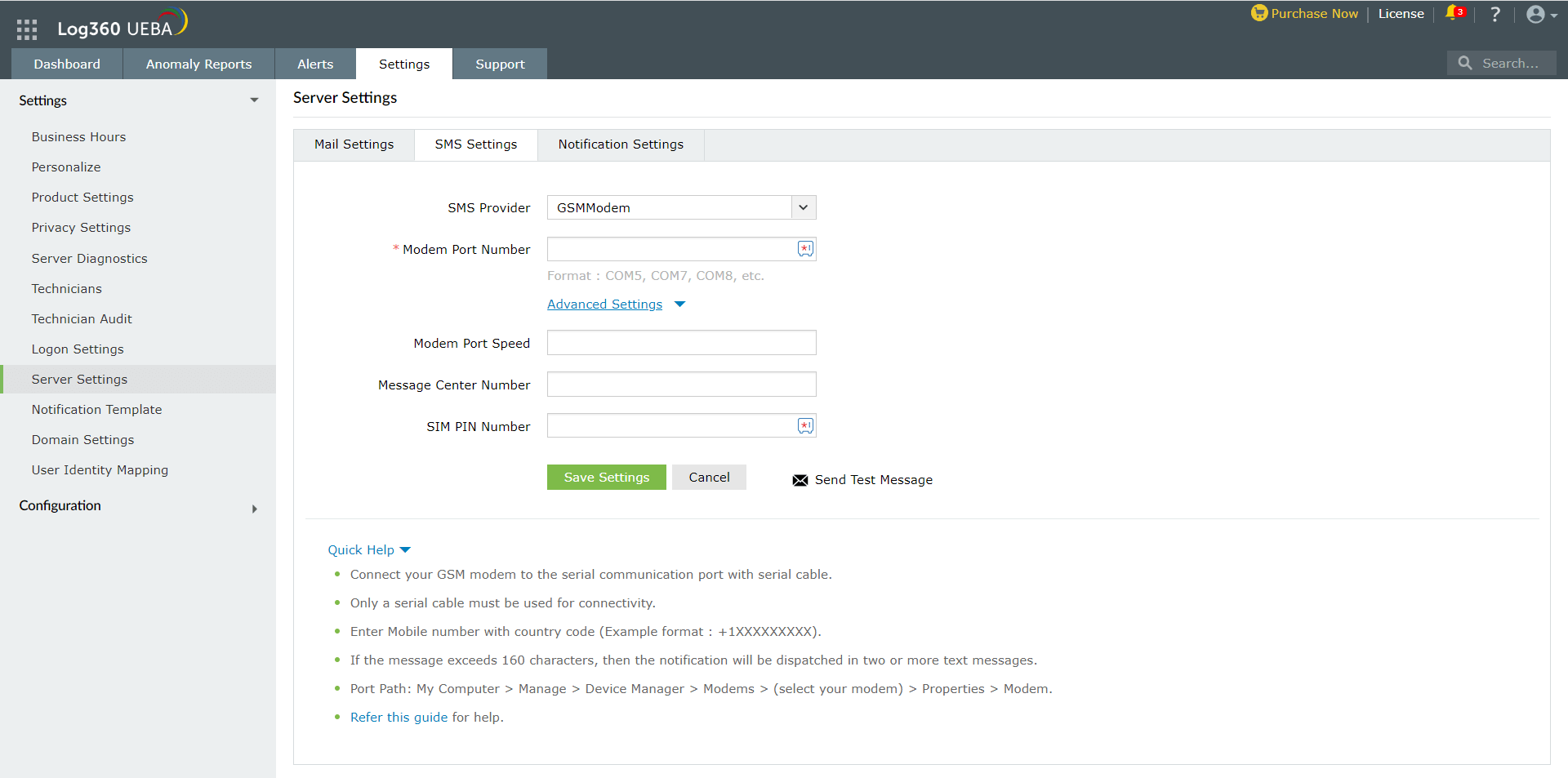 - Log360 UEBAで設定されたGSMモデムが他のアプリケーションで使用されていないことをご確認ください。