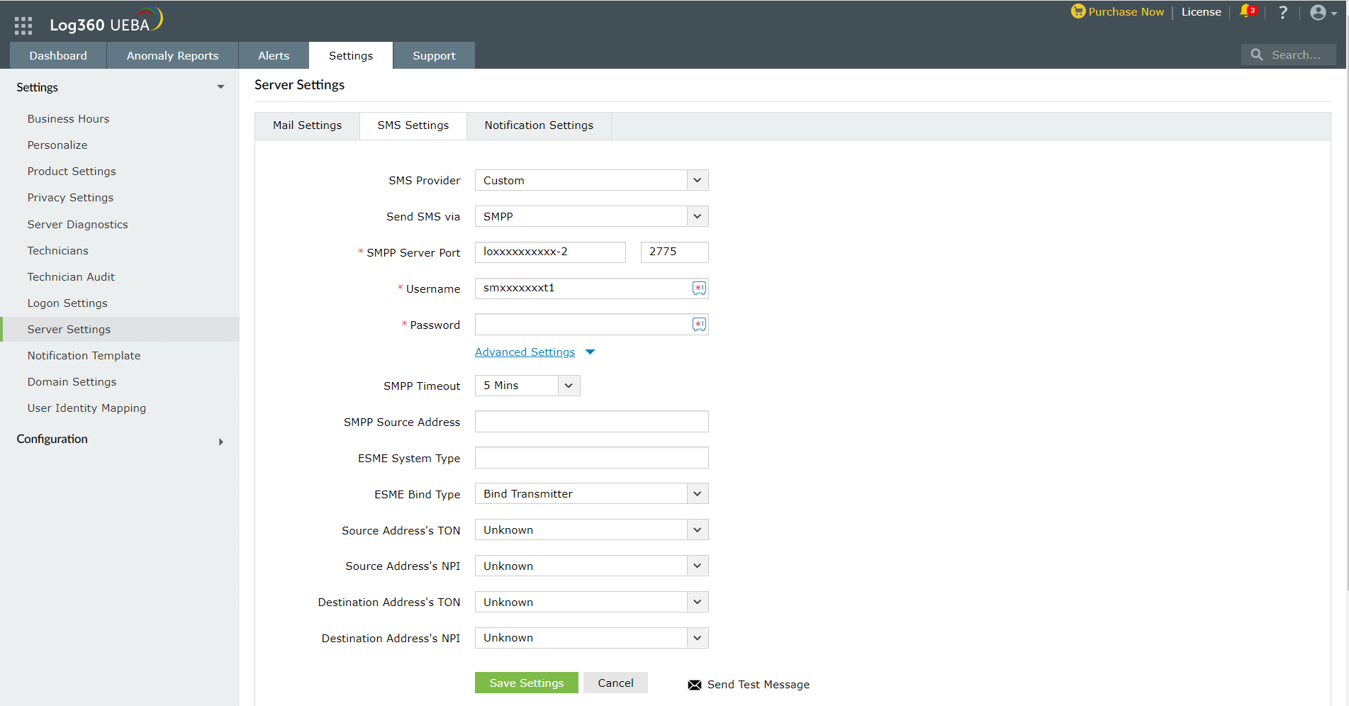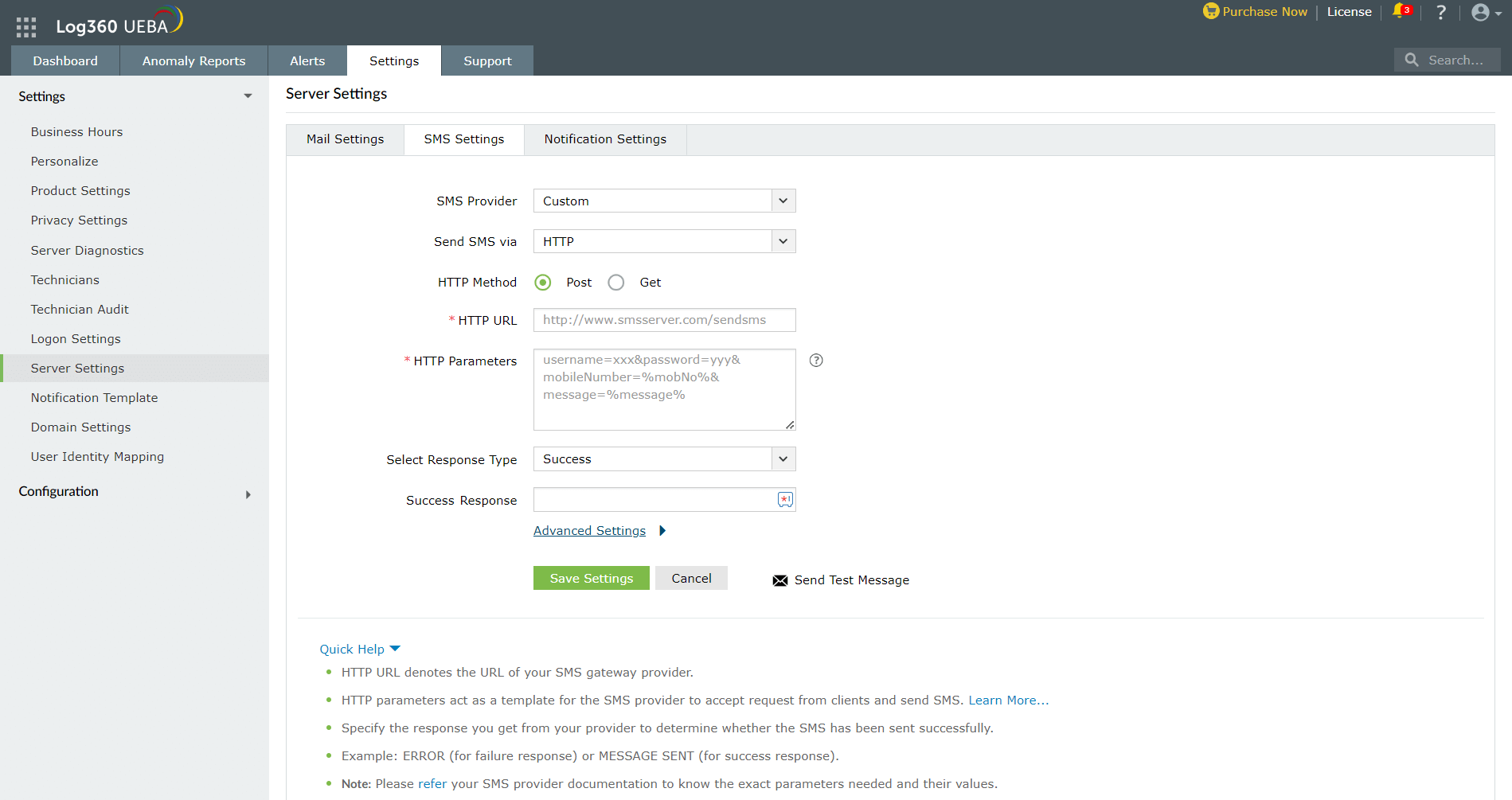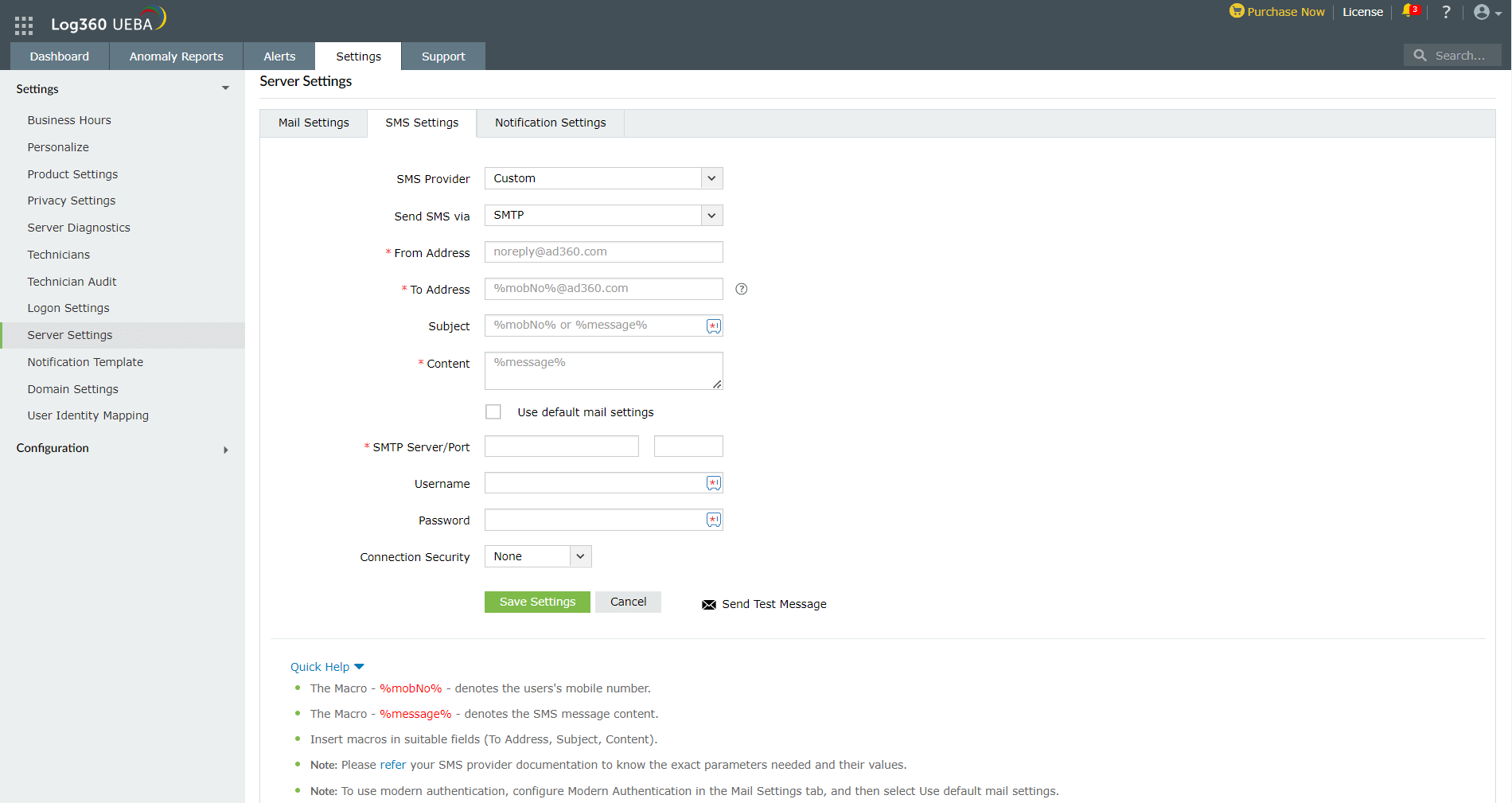 Log360 UEBAのSMSサーバーを設定するには、以下の手順を実施します。お客様ご自身のGSMモデムまたはカスタムSMSゲートウェイを使用するように設定できます。
