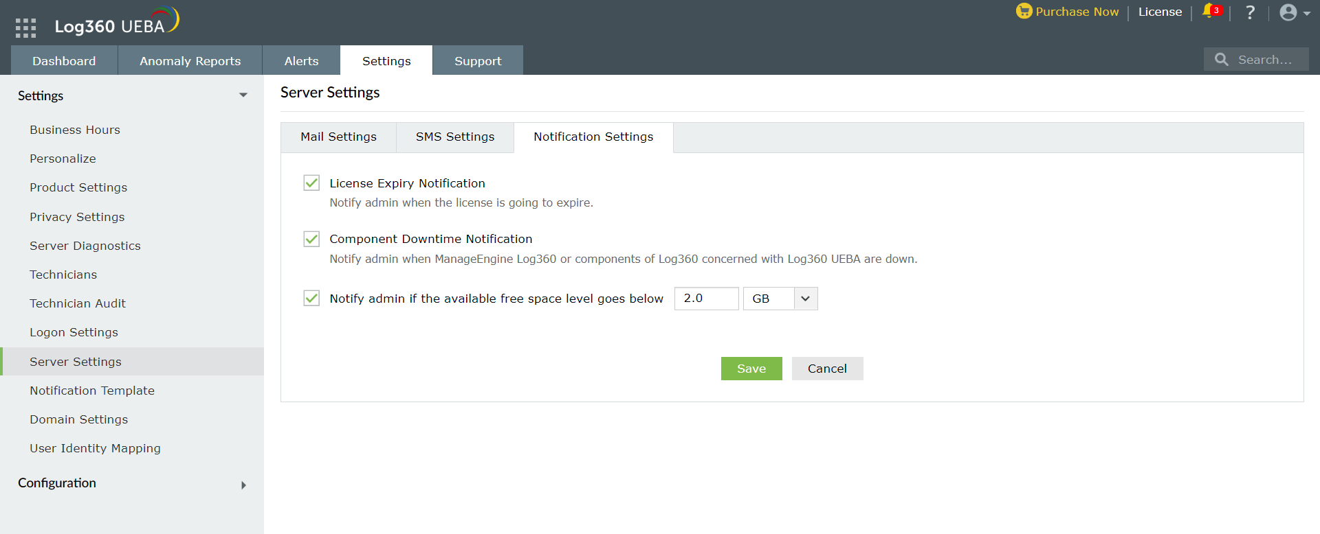 サーバー設定では、メールサーバー、SMSサーバー、製品通知を設定できます。設定されたメールサーバーとSMSサーバーは、Log360 UEBAからのアラートと通知の送信に使用されます。
