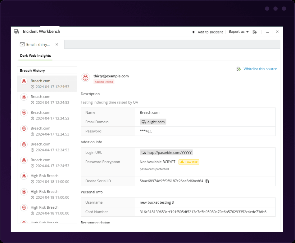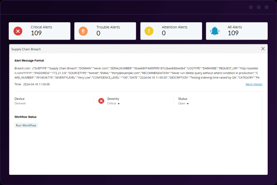 認証情報などの重要な情報の漏洩がディープウェブやダークウェブで検知された場合、即座にアラートを受信できます。このアラートにより、セキュリティチームによる迅速かつ効率的な脅威の調査・対応が可能になります。
