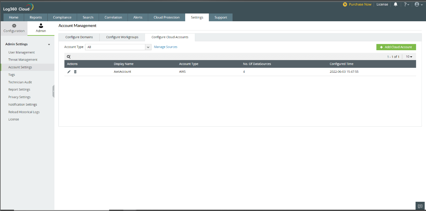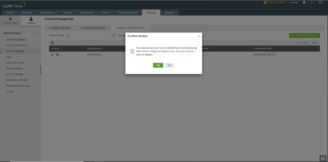 - [クラウドアカウントを構成]タブを選択し、希望するクラウドアカウントに対応する[削除]アイコンをクリックします。