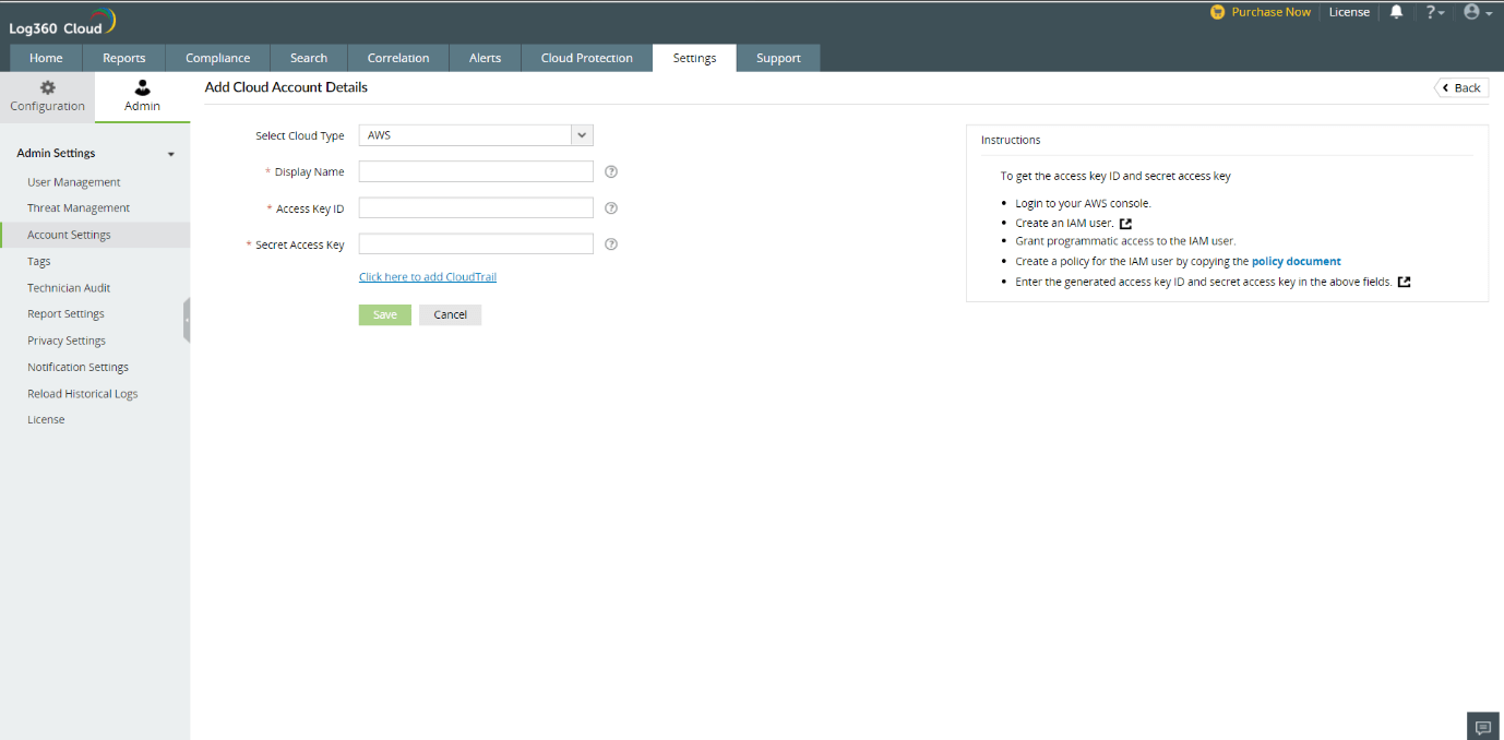 - CloudTrailアカウントを追加するには、ページにあるリンクをクリックします。