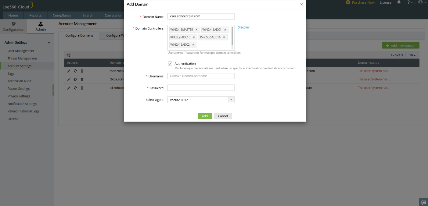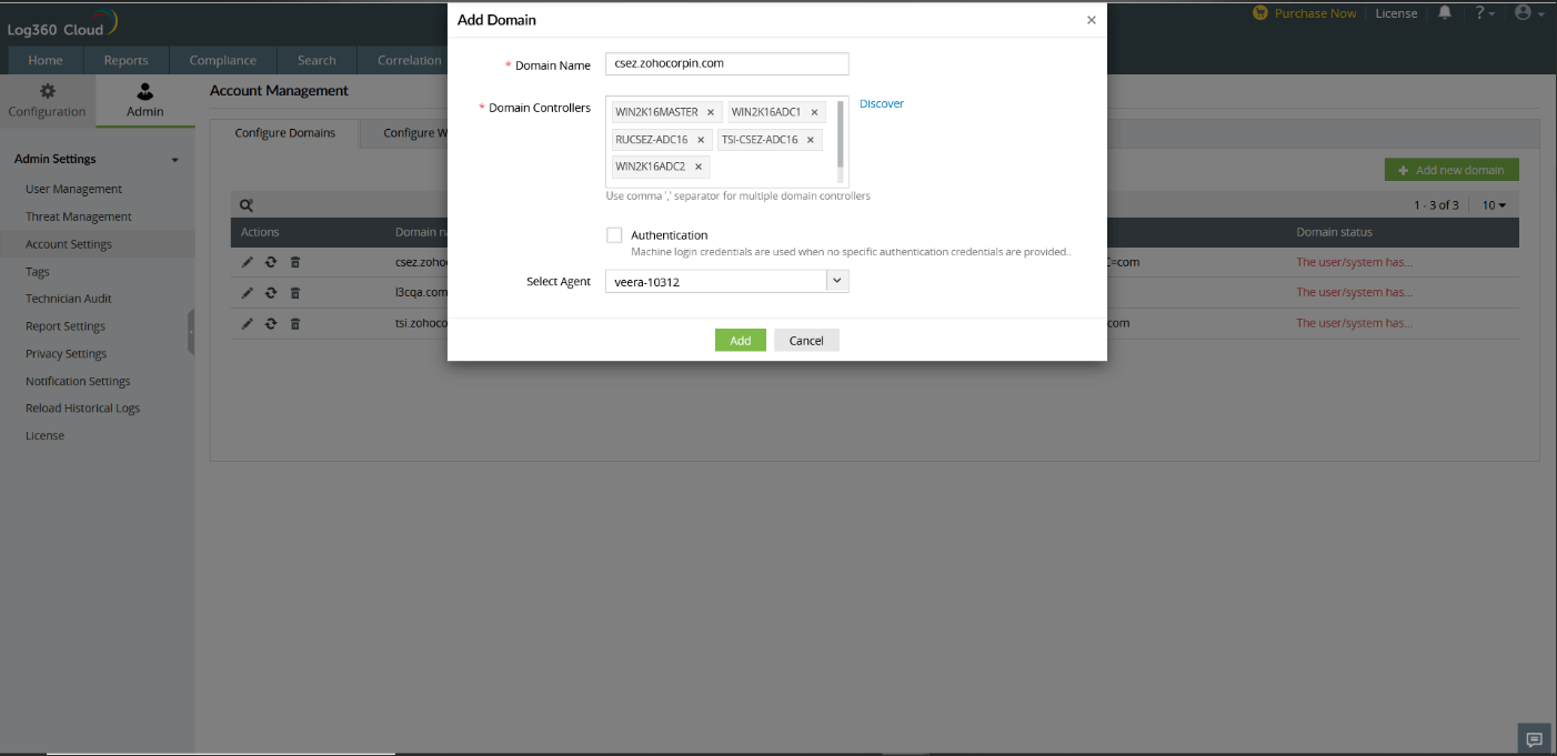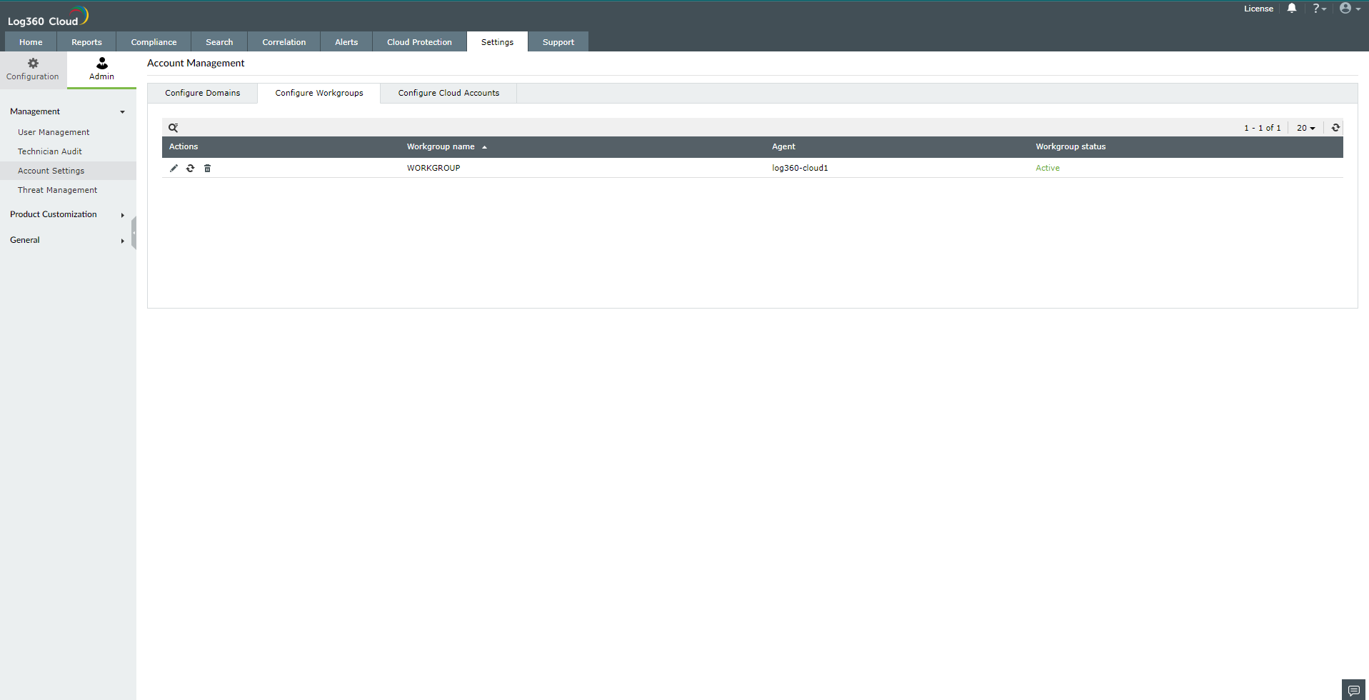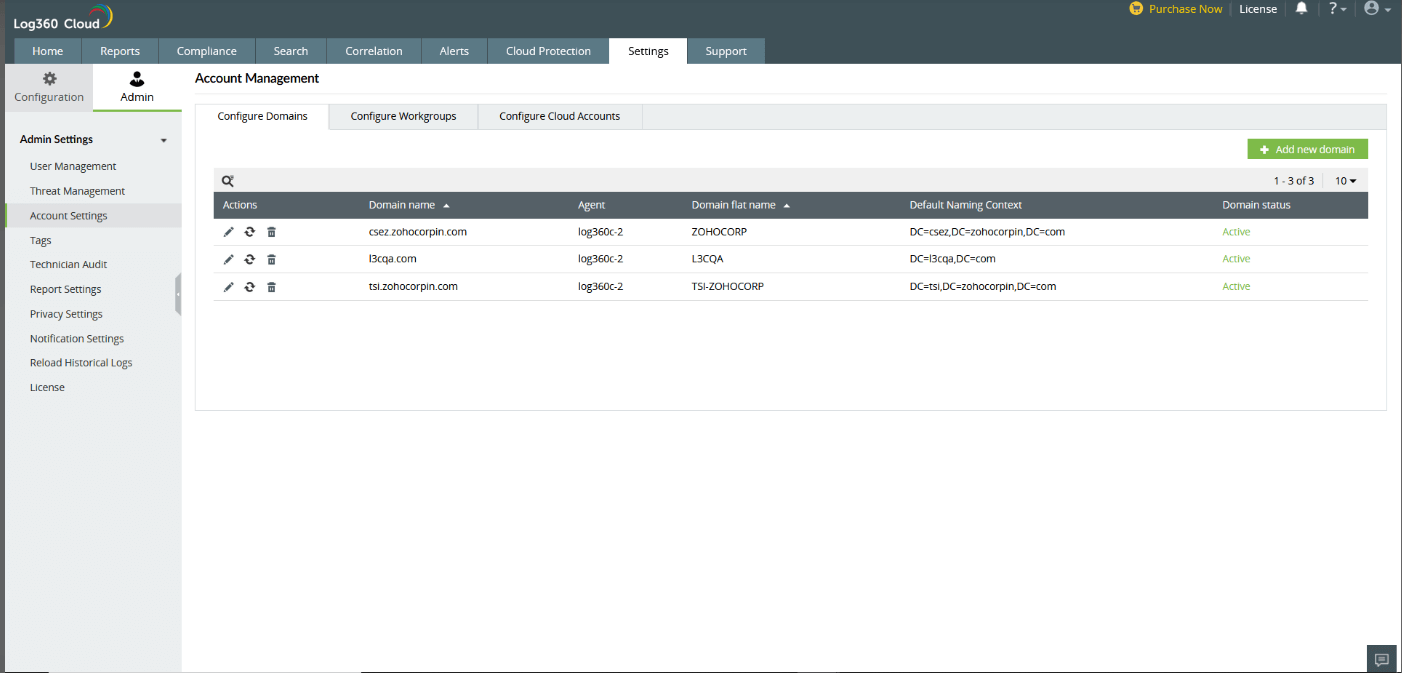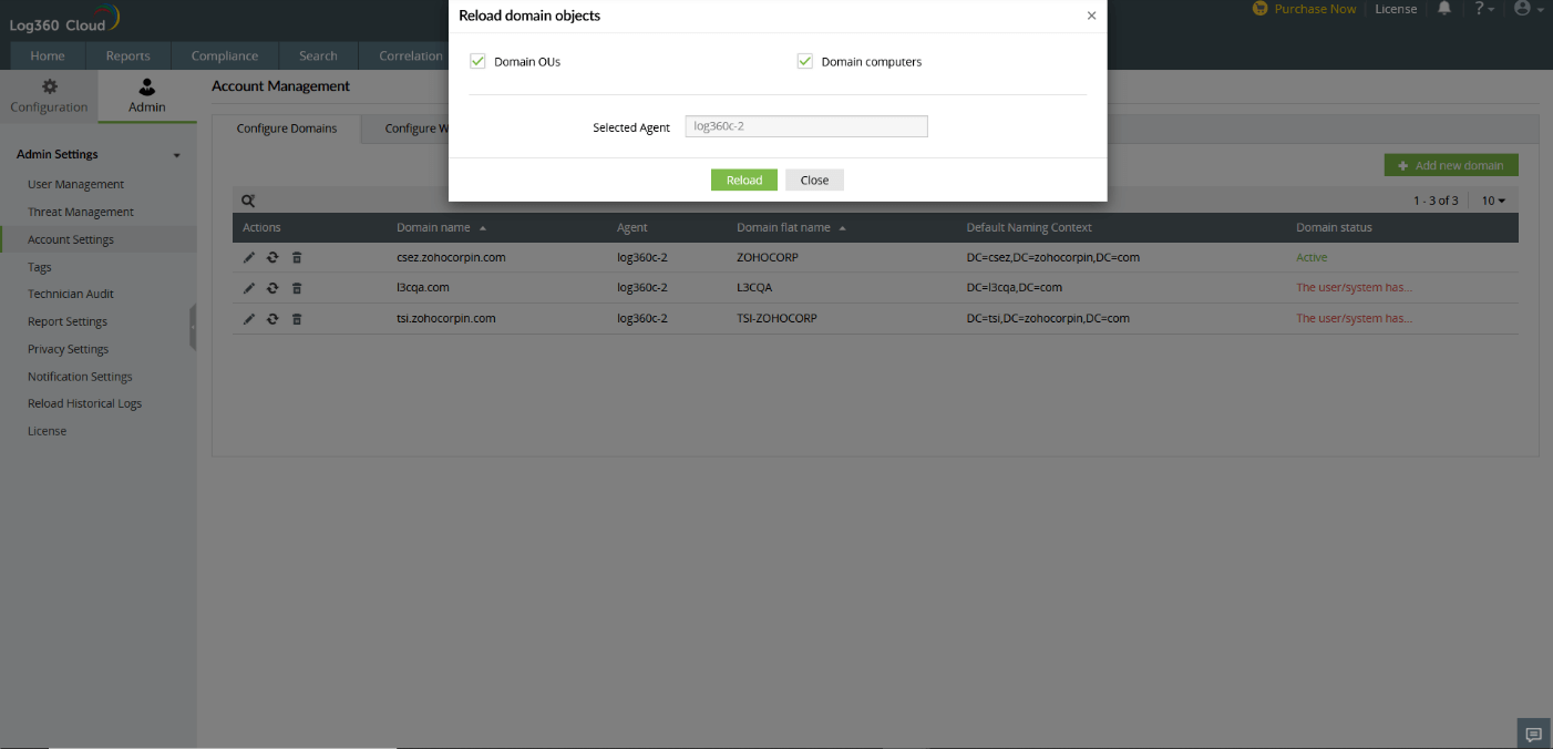 ドメインとワークグループページには、すべてのActive Directoryドメインと、 Log360 Cloudエージェントが表示するワークグループが一覧表示されます。それぞれのアイコンをクリックして、ドメインを更新、リロード、および削除するオプションがあります。