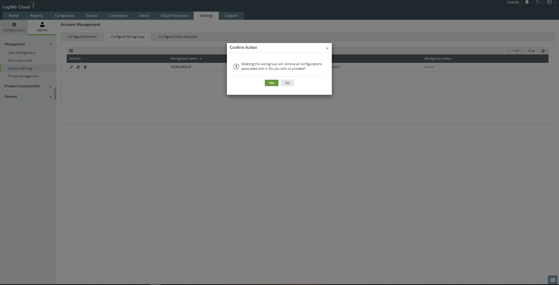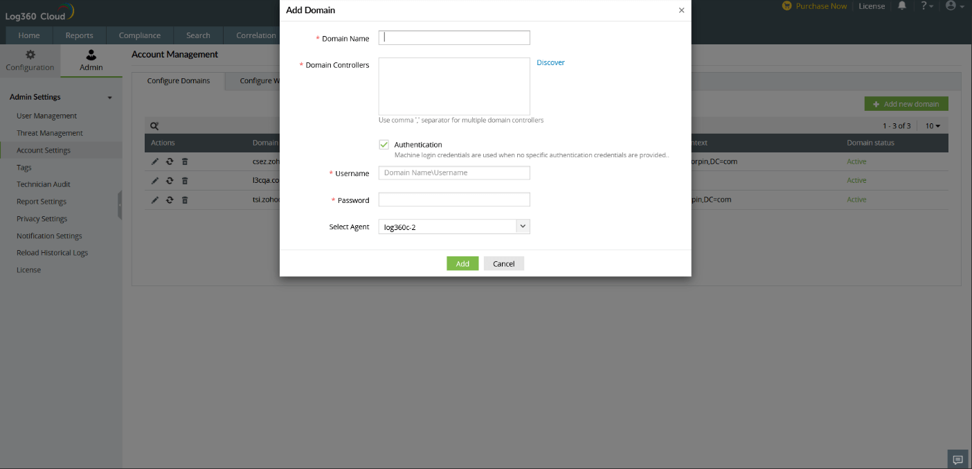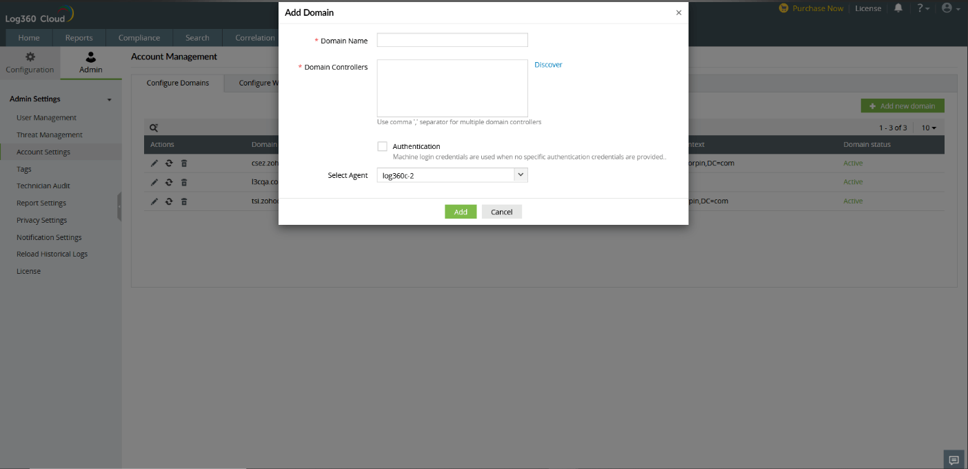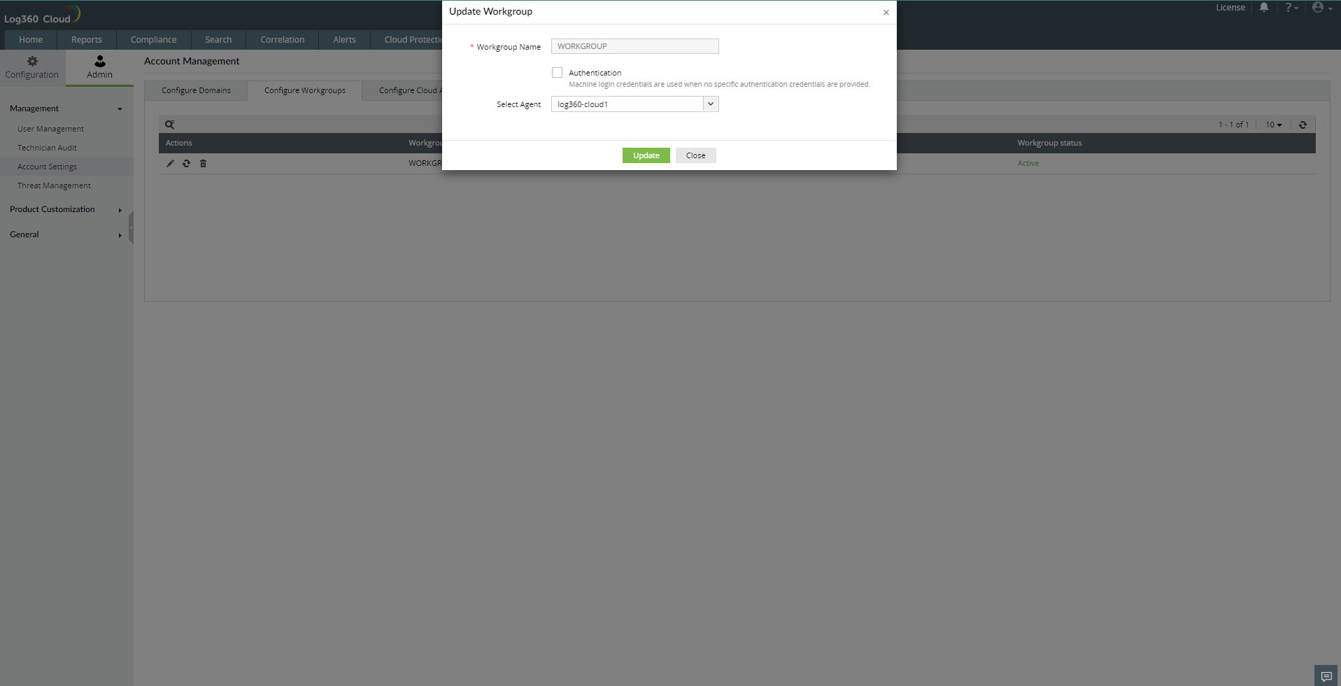ドメインとワークグループページには、すべてのActive Directoryドメインと、 Log360 Cloudエージェントが表示するワークグループが一覧表示されます。それぞれのアイコンをクリックして、ドメインを更新、リロード、および削除するオプションがあります。