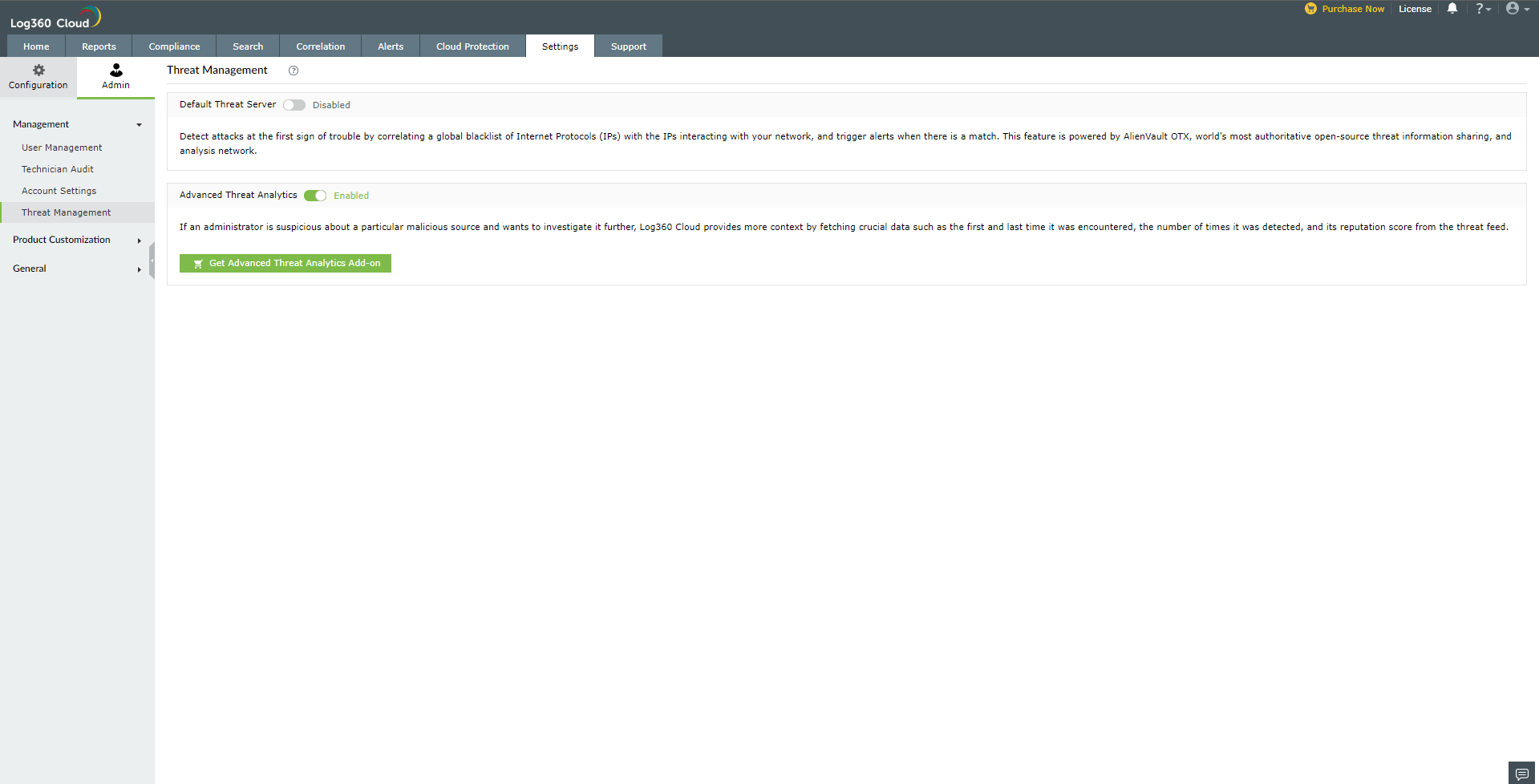 注記: この機能は、すべてのLog360 Cloud顧客がアドオンとして利用できます。ATAアドオンは、脅威構成ページまたはライセンスページのいずれかから購入することができます。