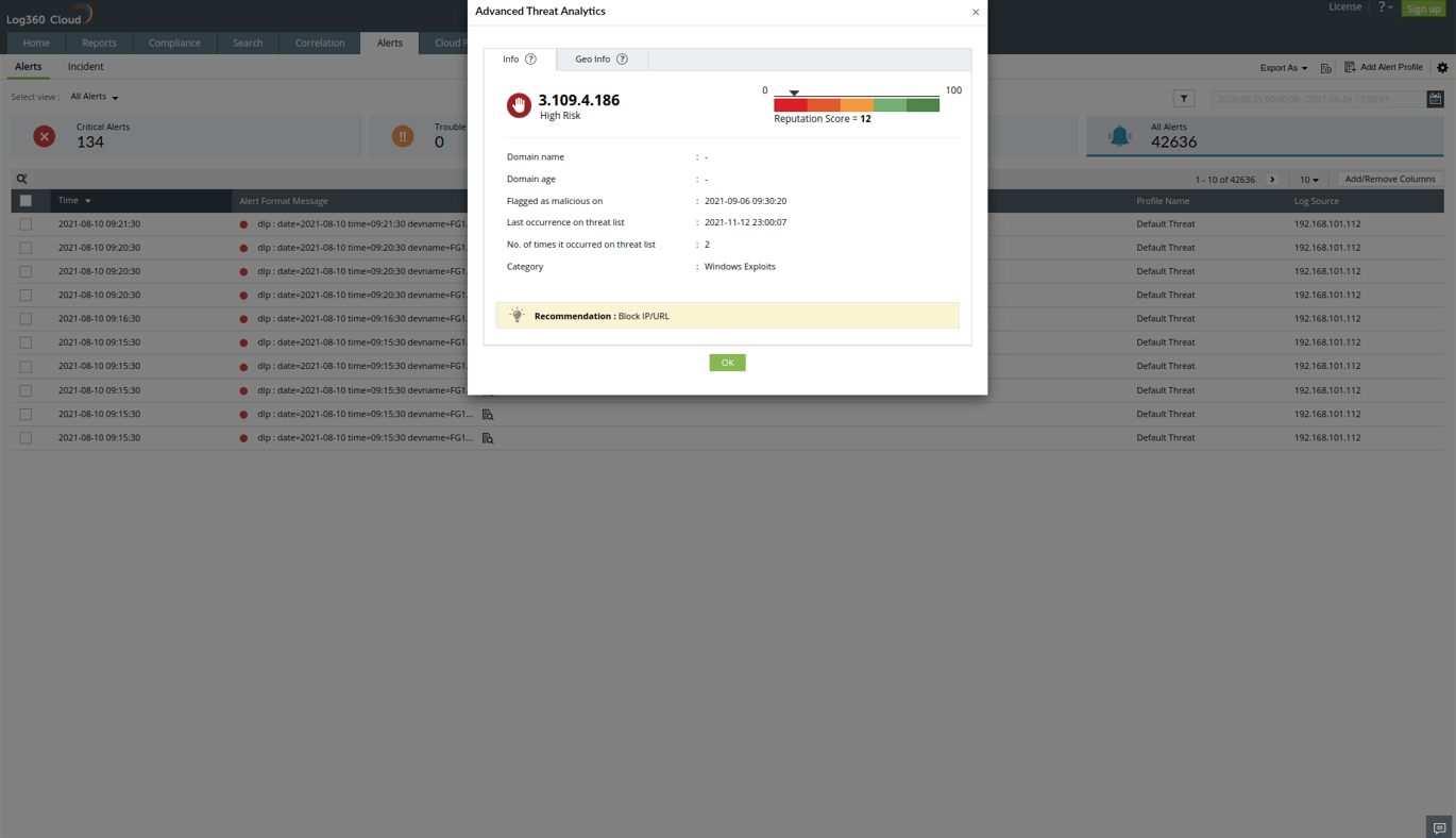 - Log360 Cloudは、悪意あるIPがネットワークに接続しようとしたときは常にアラートを送信します。