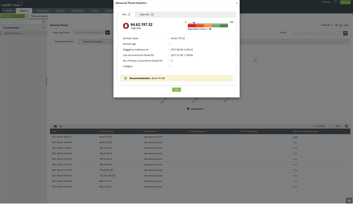 このオプションでは、Log360 Cloudは、初回および最終検出時刻、レピュテーションスコア等の重大なデータを脅威フィードから関連づけて、攻撃の可能性についてより詳しい状況を提供できます。