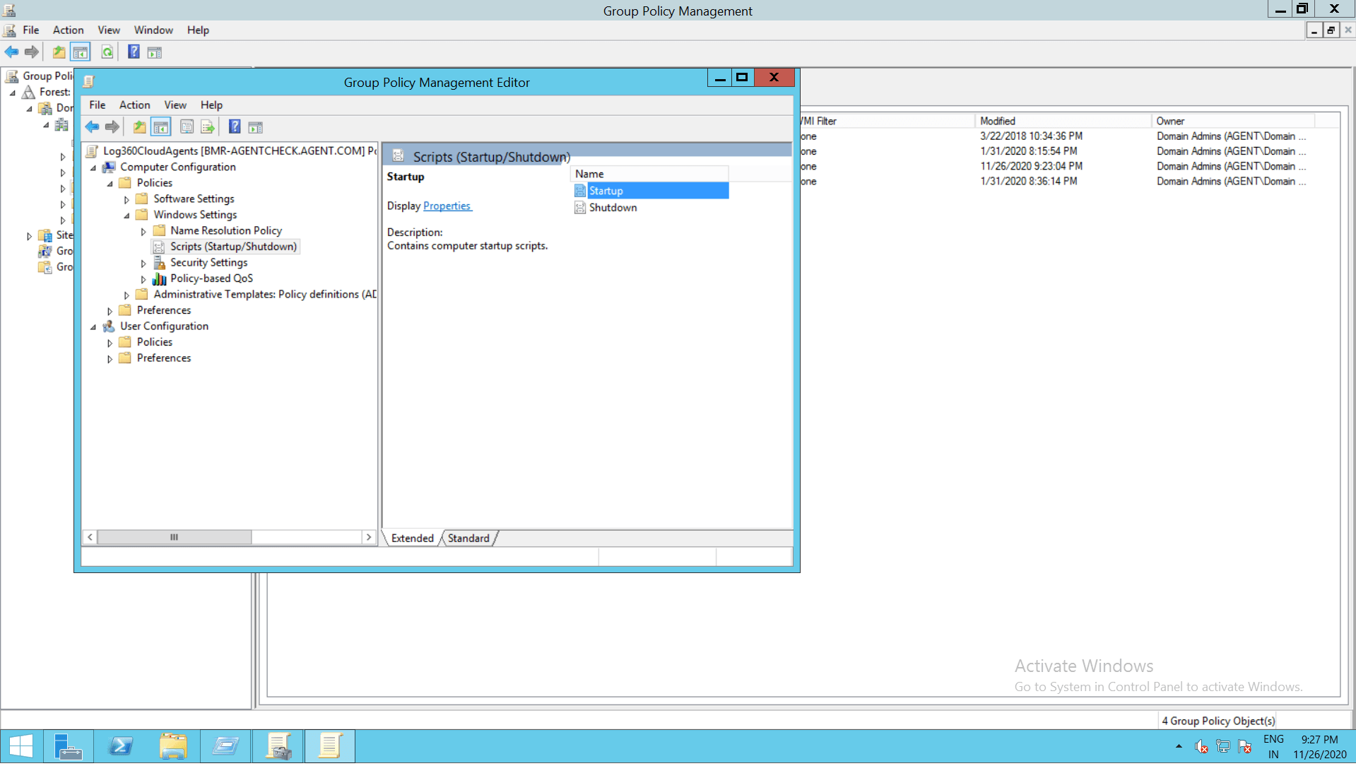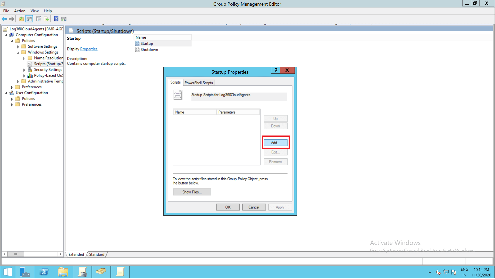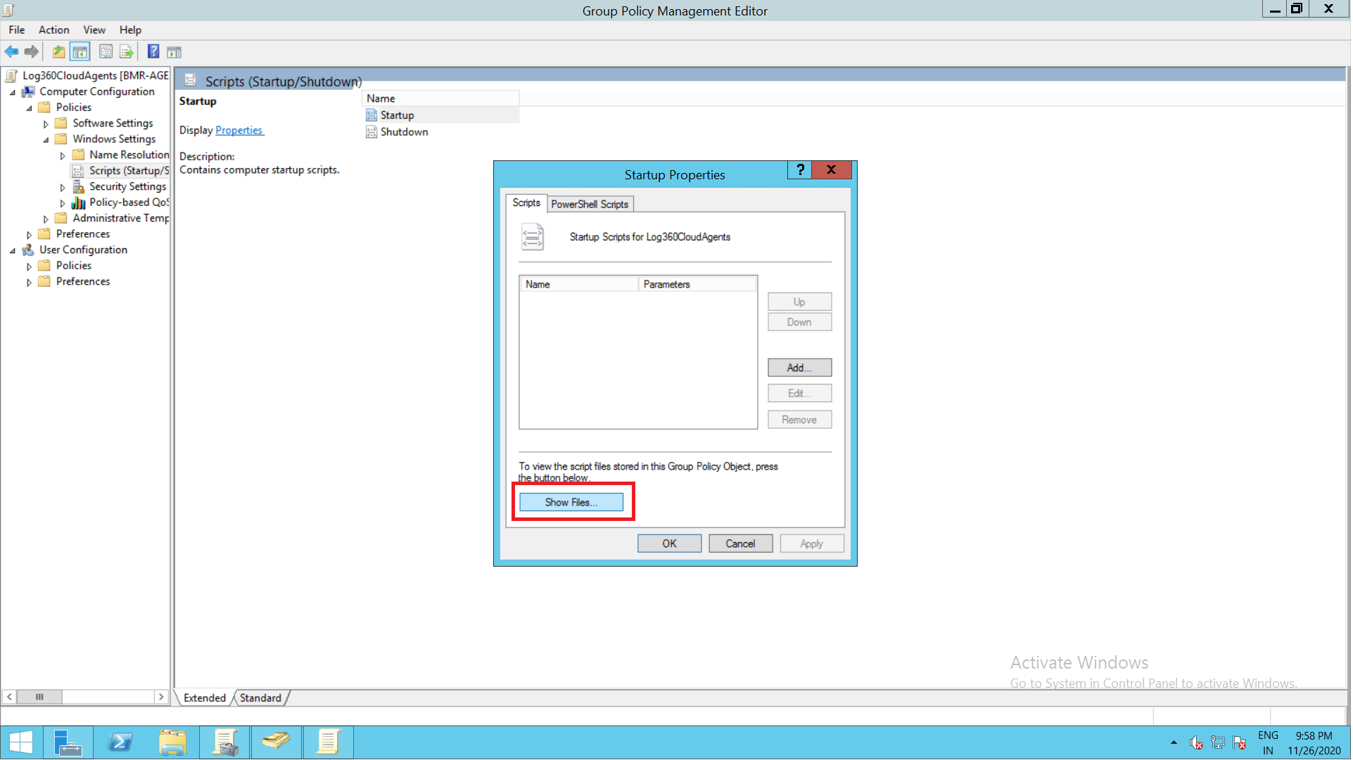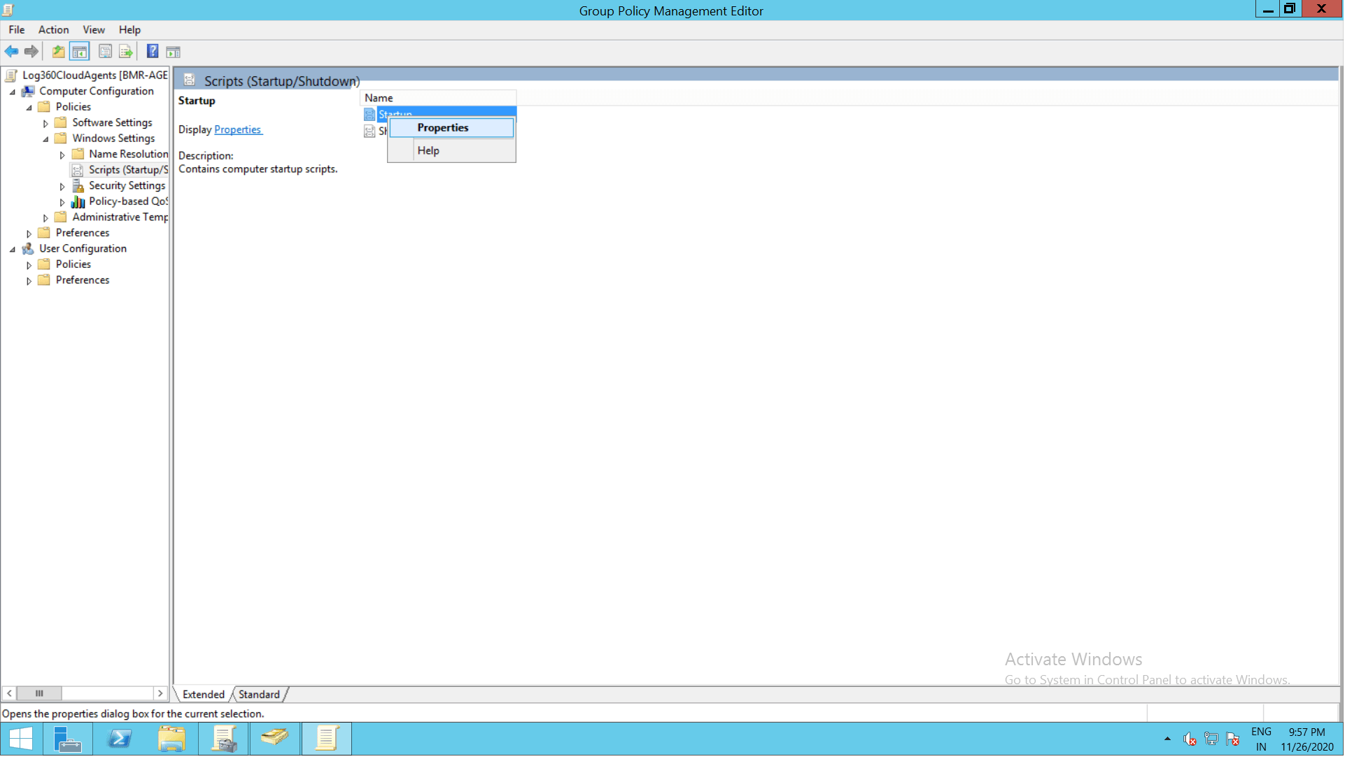 - Windows Server 2008以降の場合は、[コンピューター構成] → Policies[ポリシー] → [Windows設定] → [スクリプト](スタートアップ/シャットダウン) → Startup[スタートアップ]の順に移動します