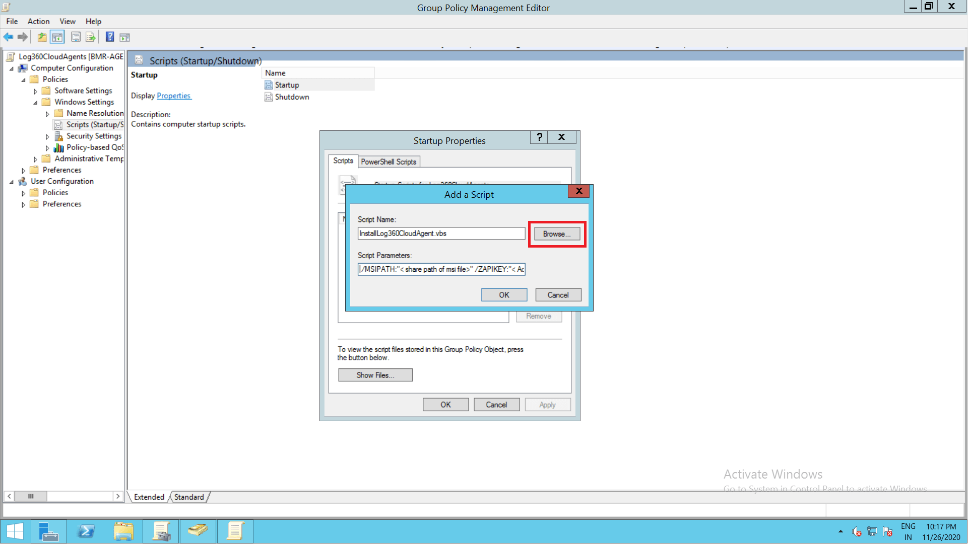 - スクリプト名で、[参照]をクリックしInstallLog360CloudAgent.vbsスクリプトを選択します。