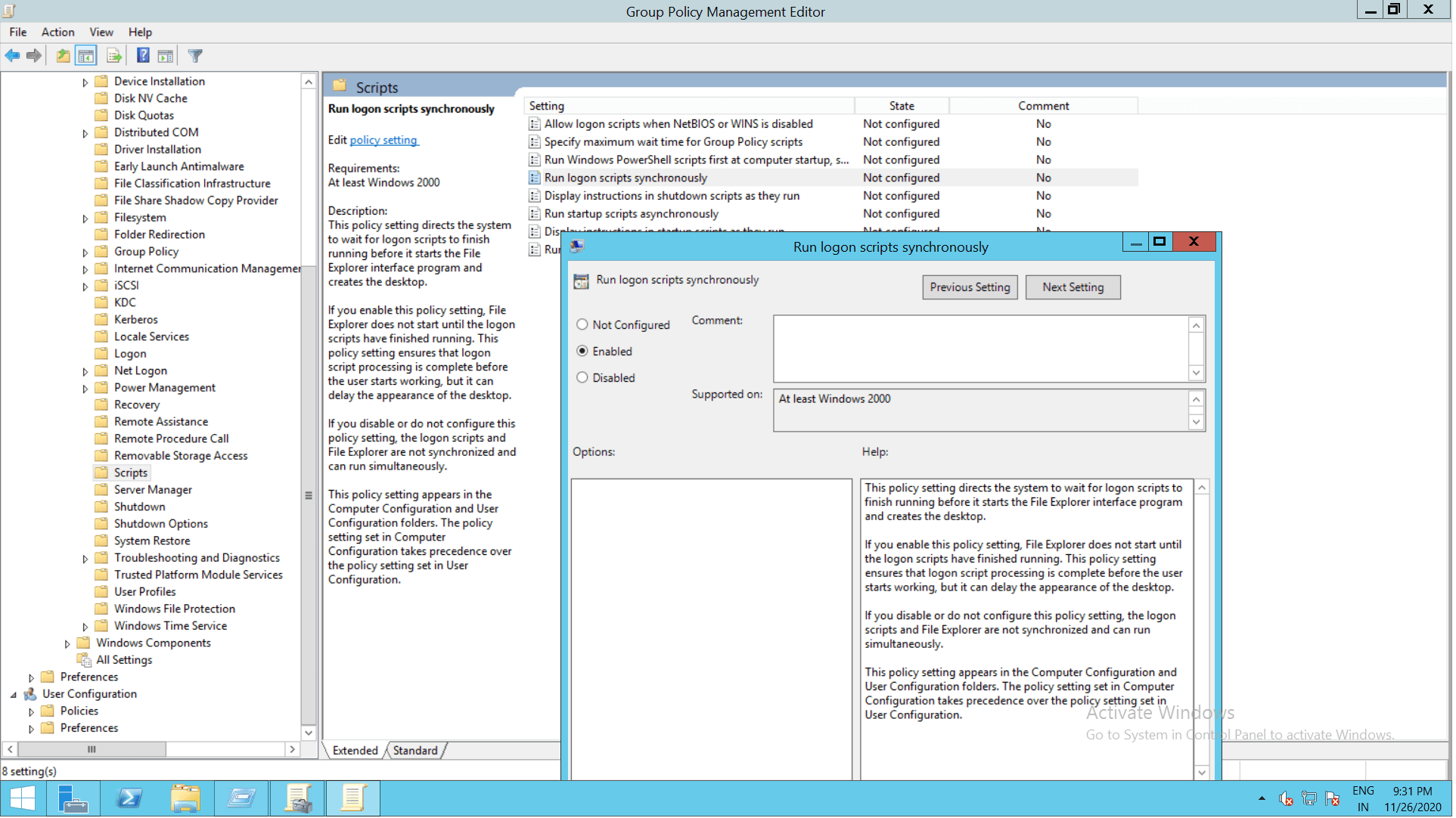 - GPOエディタの右ペインで、 [ログオンスクリプトを同期実行]をダブルクリックして、有効にします。
