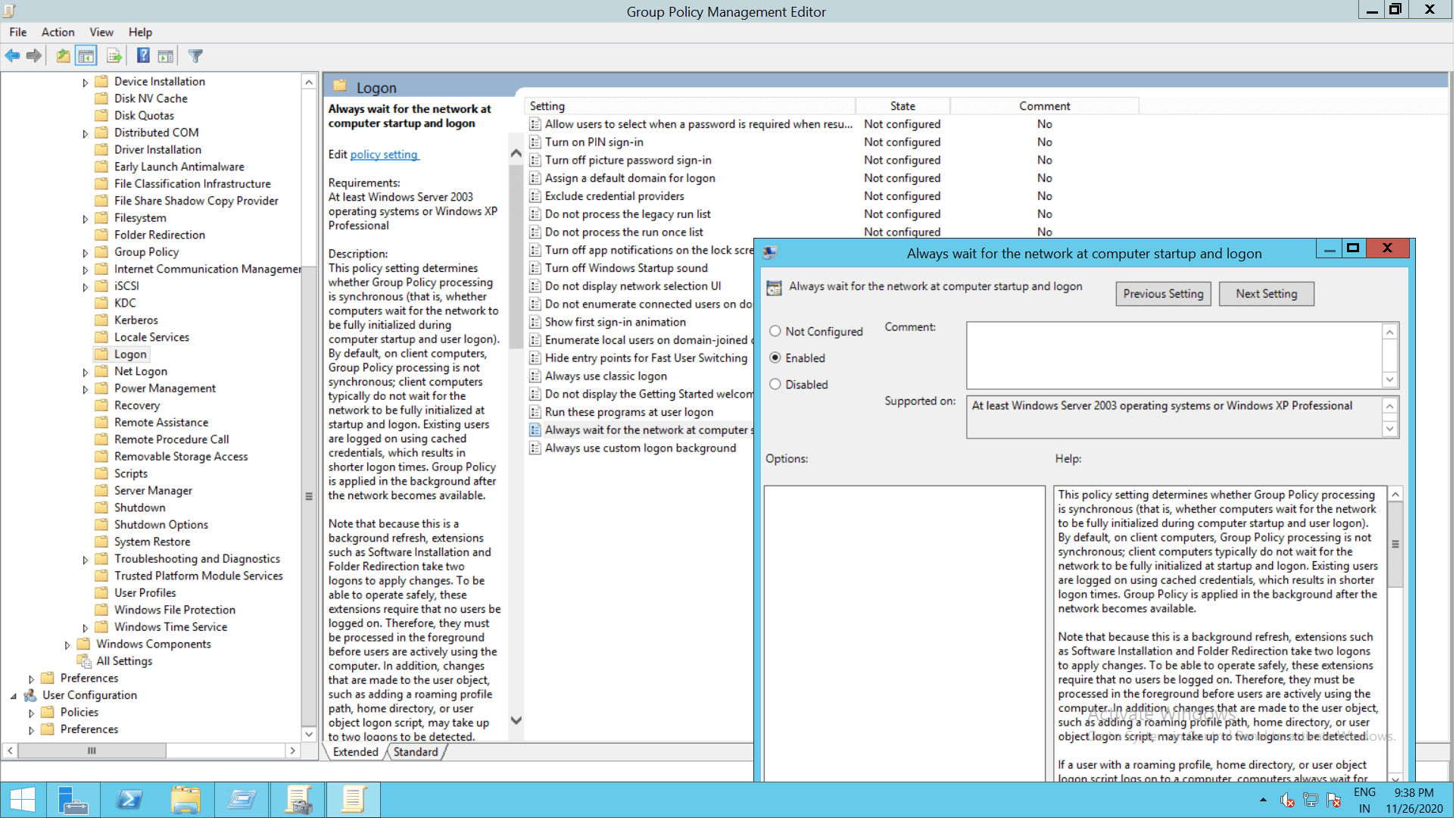 - 右ペインで、[スタートアップとログオン時は常にネットワークを待機]をダブルクリックして、有効にします。