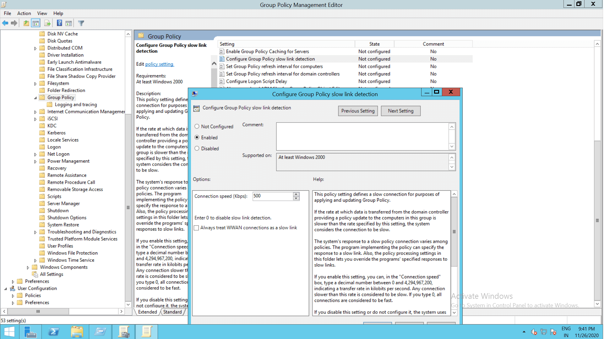 - 右ペインで、[グループポリシー遅速リンク検出]をダブルクリックして、有効にします。
