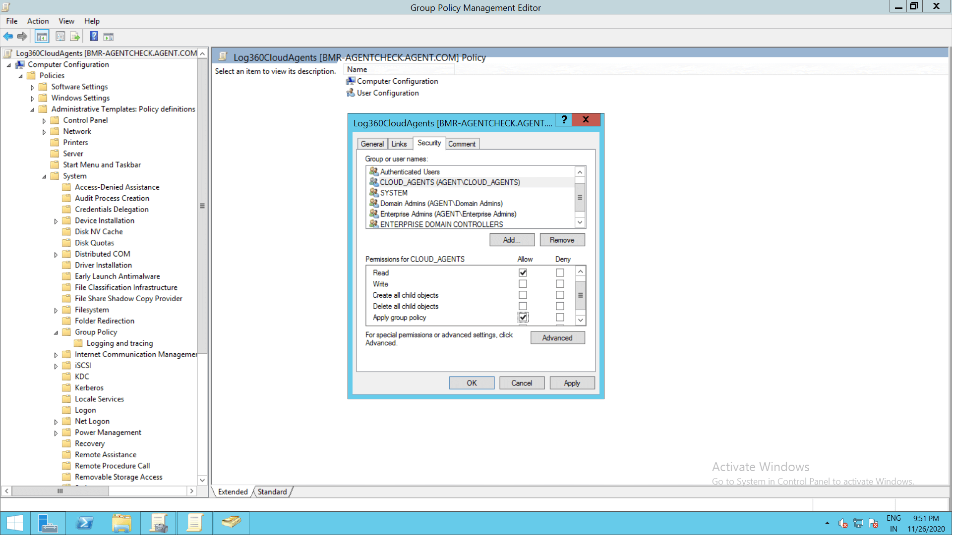 - [セキュリティ]タブに移動し、[認証済ユーザーにグループポリシー許可を適用]の選択を解除します。.