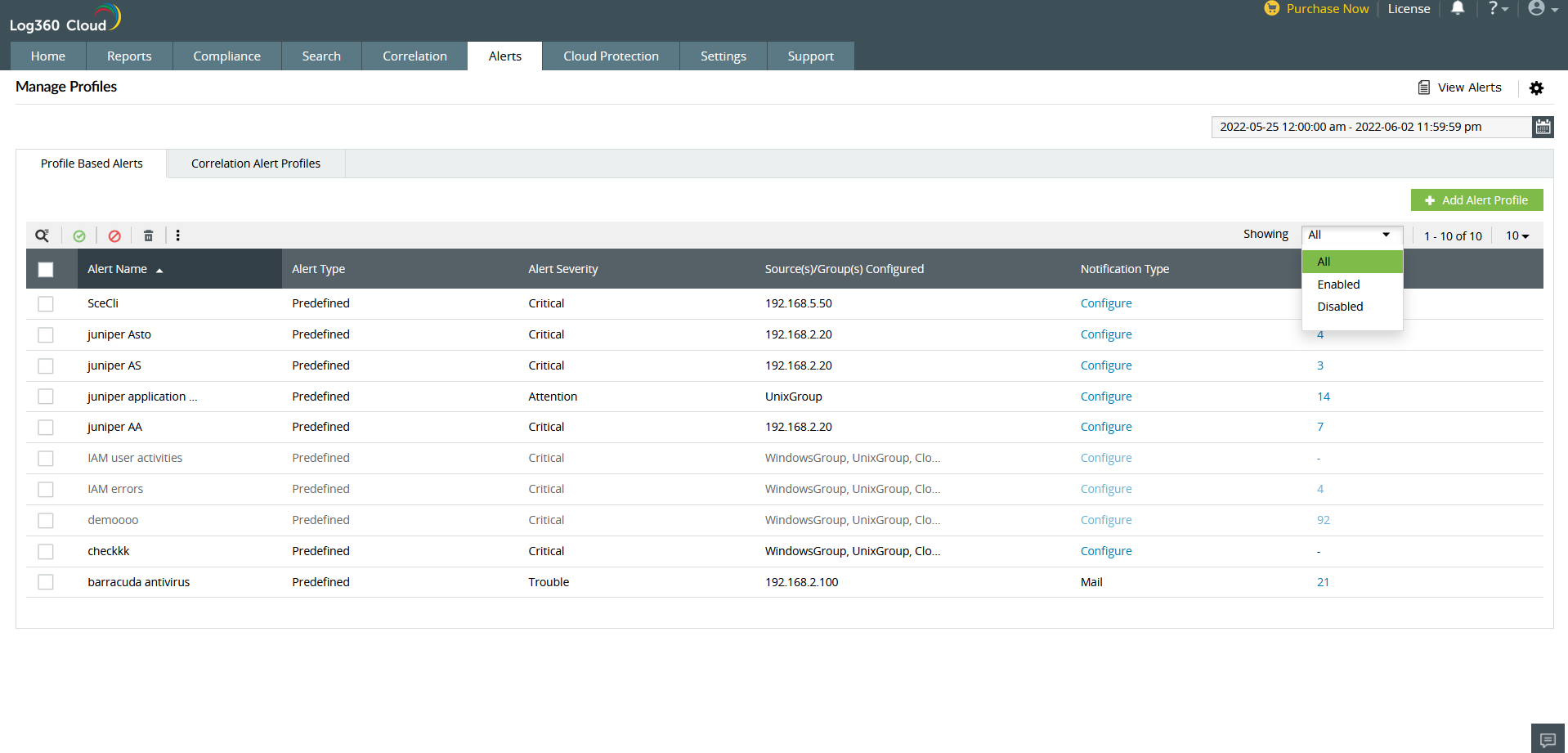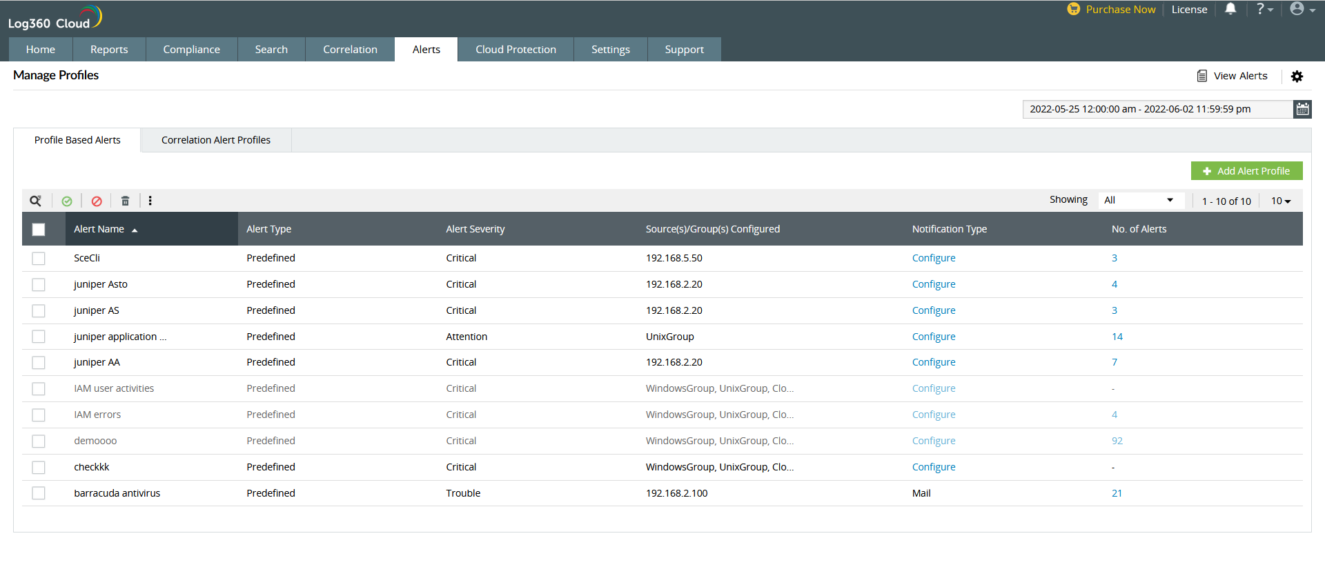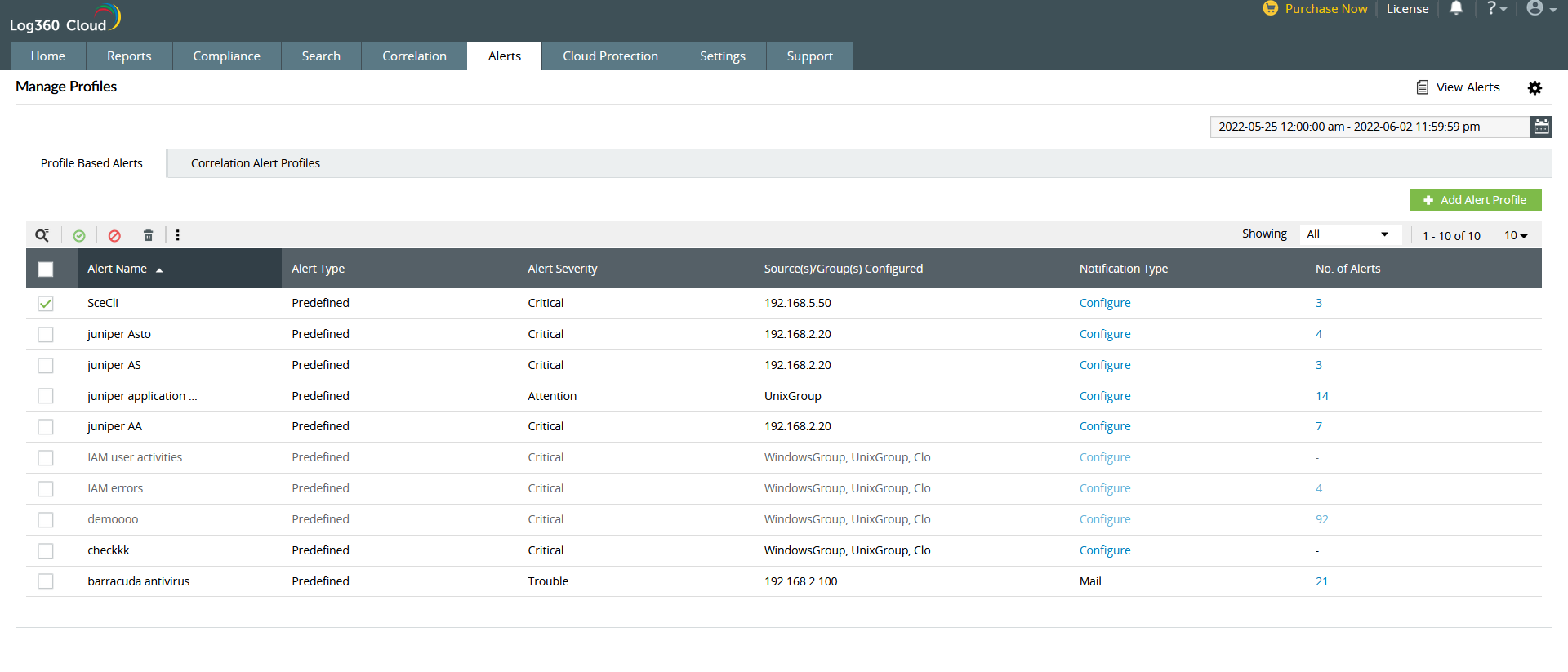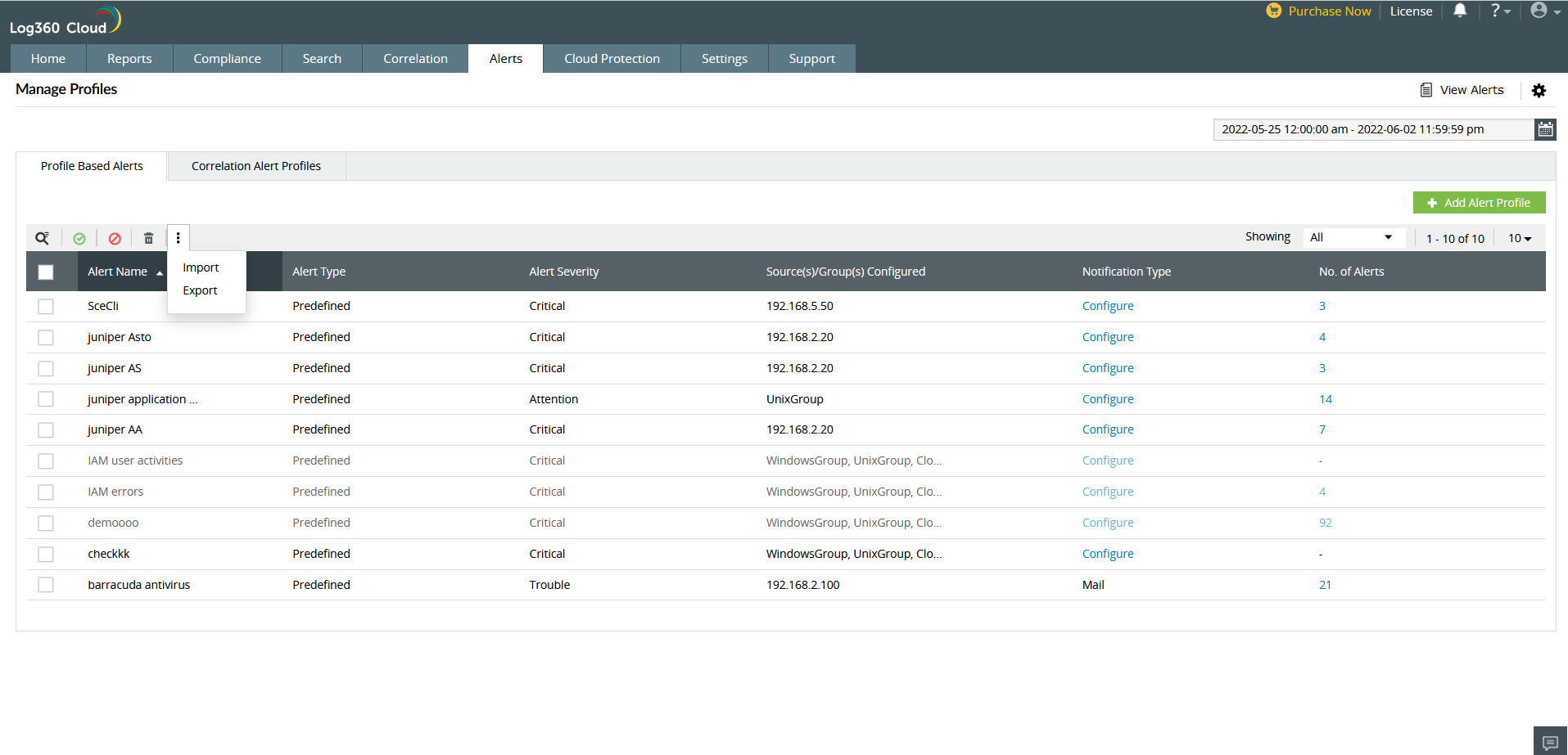 Log360 Cloudでは、構成したアラートプロファイルをXMLファイルでエクスポートまたはインポートできます。