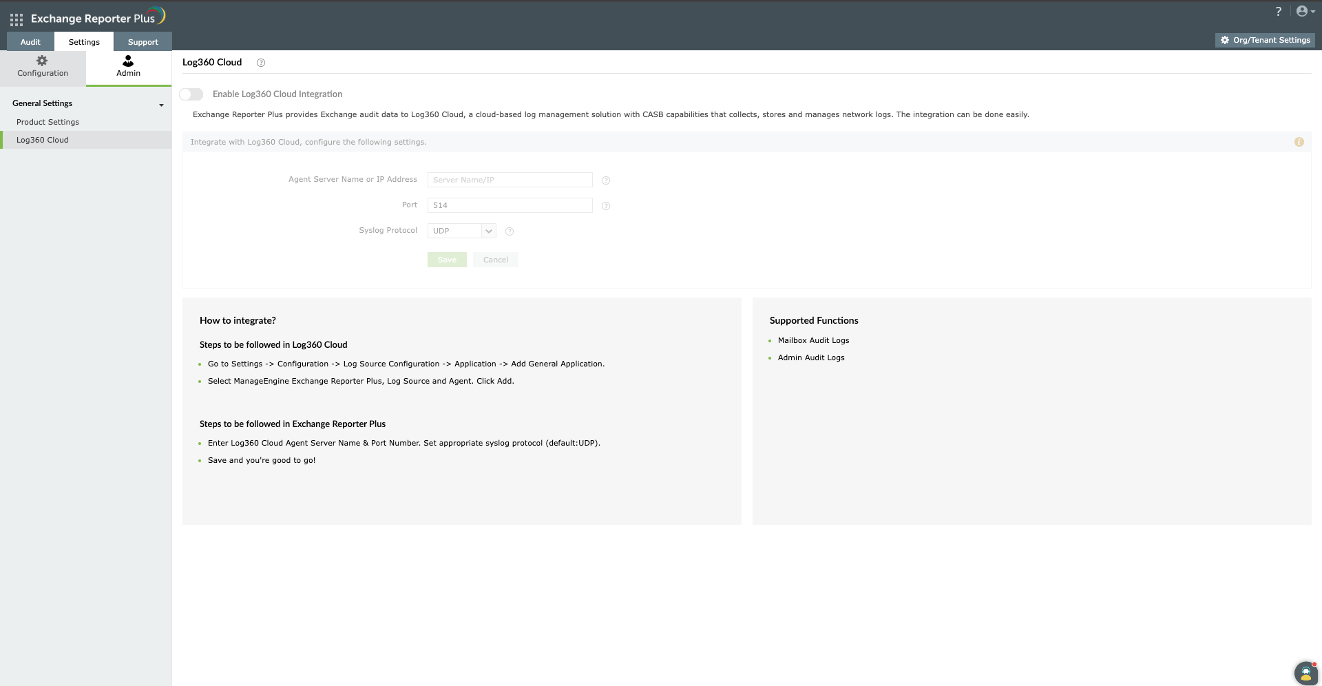 - [Settings]→[Admin]→[General Settings]→[Log360 Cloud]をクリックします。