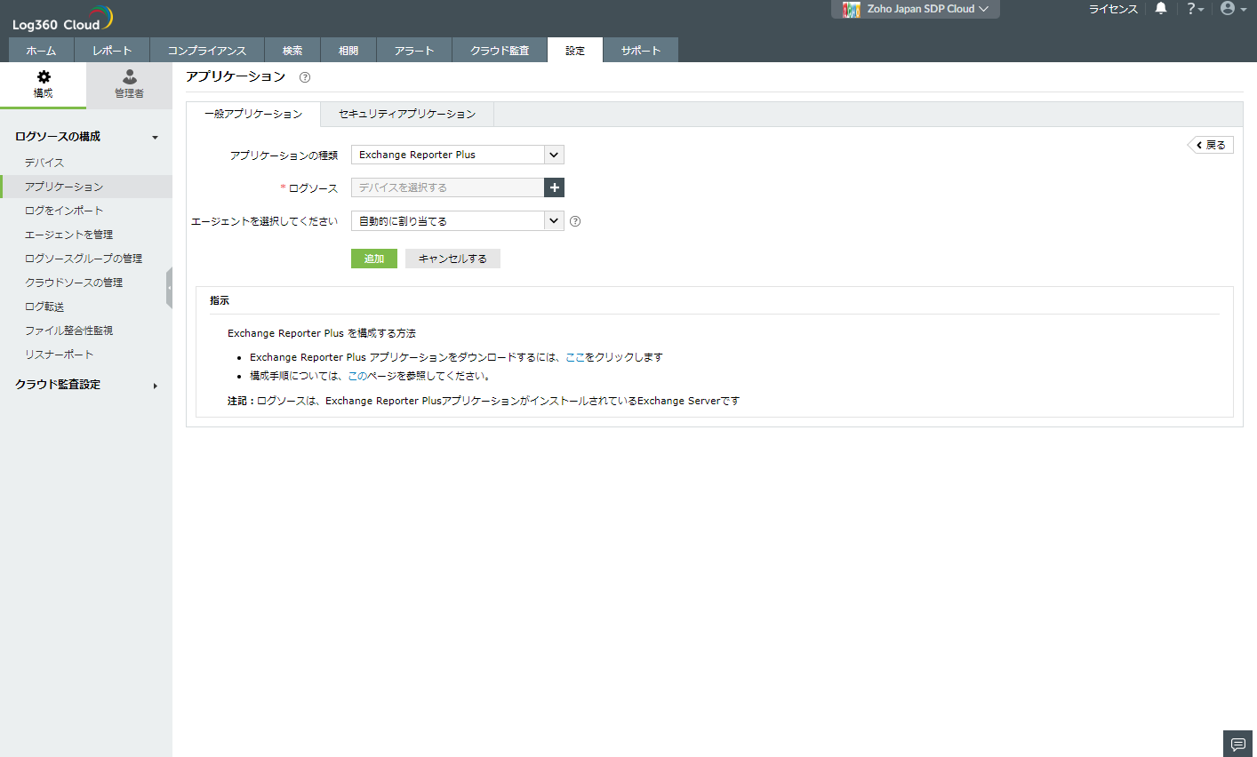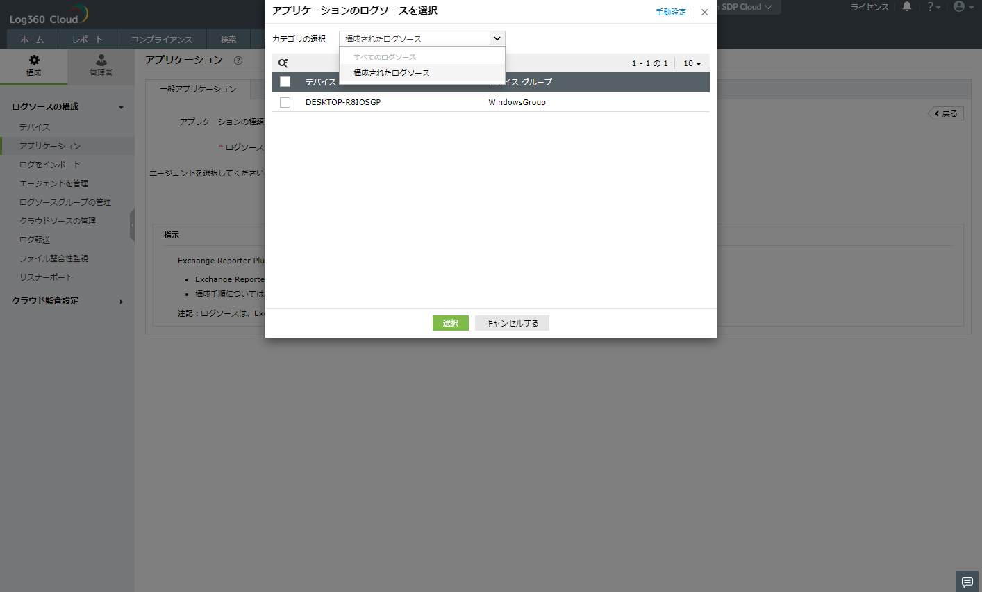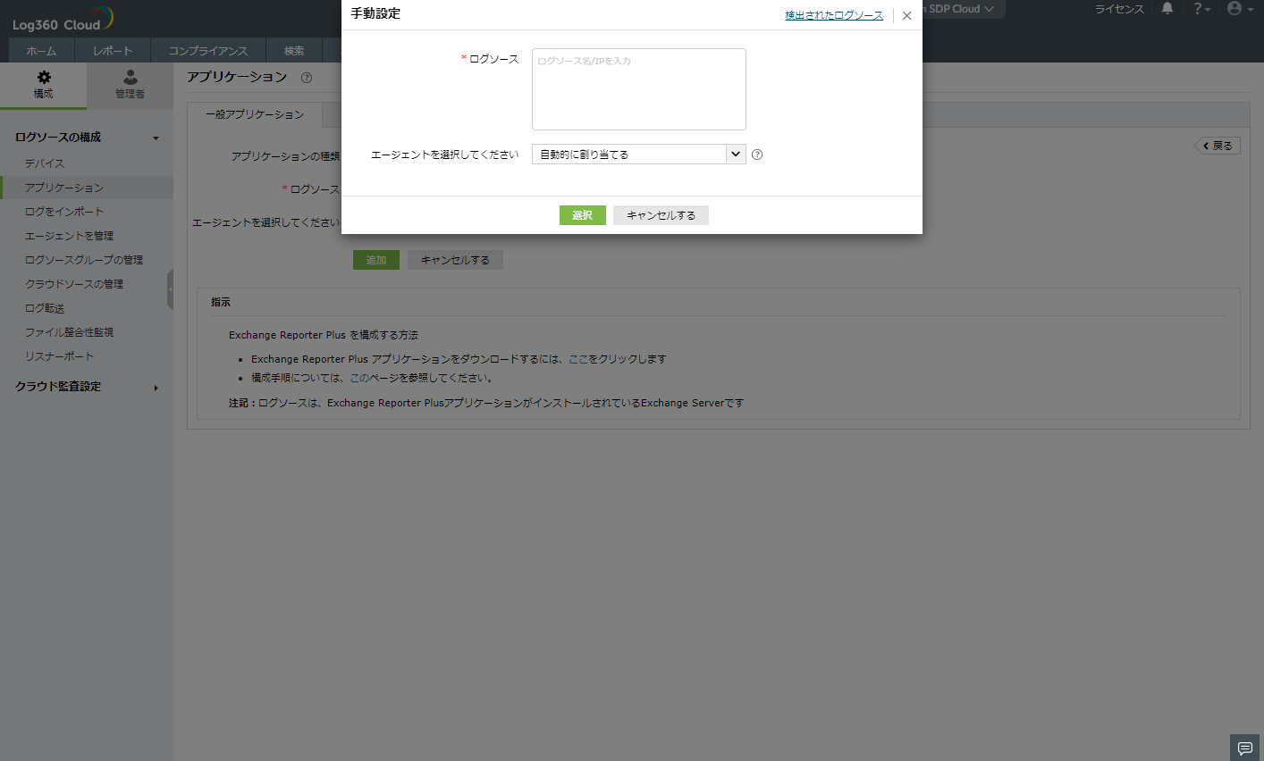 ログソースはExchange Reporter Plusがログを送信する元となるデバイスです、 - 「エージェントを選択してください」ドロップダウンを使用し、ログの転送を担うエージェントを選択します。