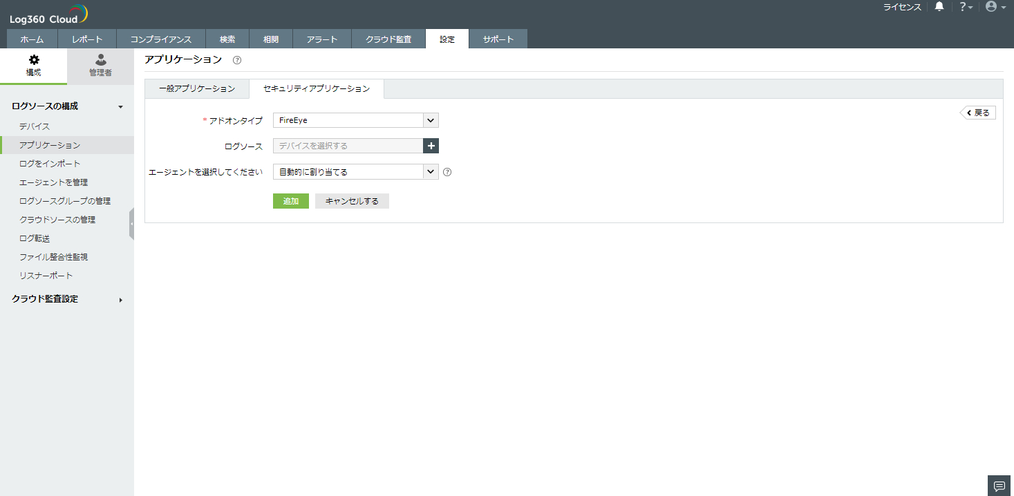 - [設定]→[構成]→[ログソースの構成]→[アプリケーション]に移動します。