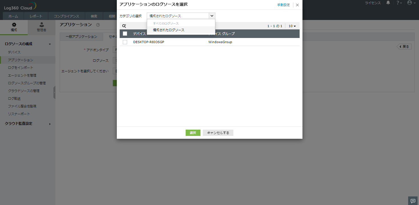 - メニューから構成済みのログソースやワークグループデバイス、ドメインデバイスなどを選択します。