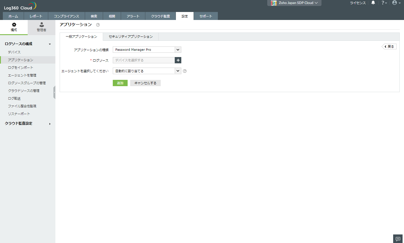 - [設定]→[構成]→[ログソースの構成]→[アプリケーション]に移動します。