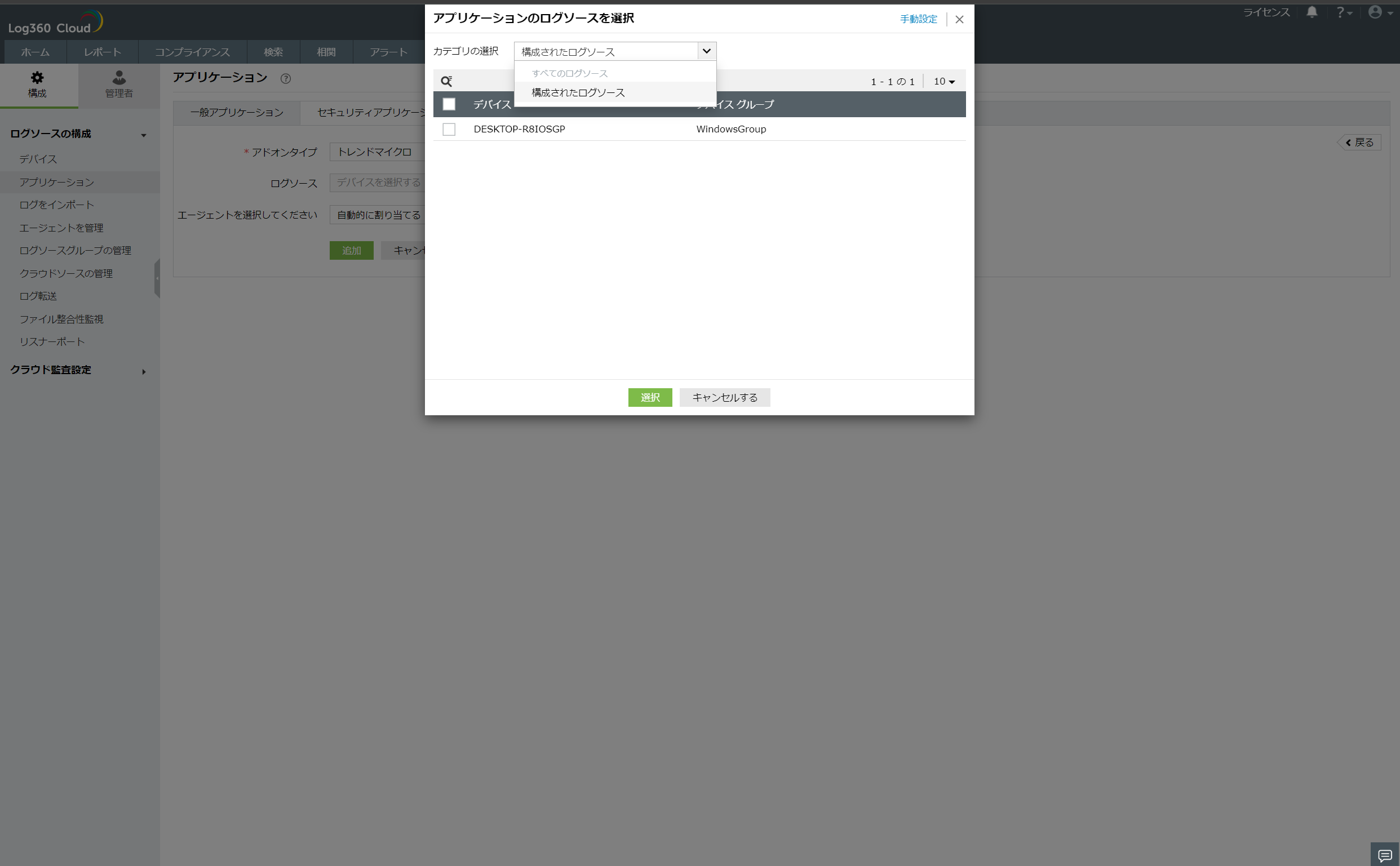 - メニューから構成済みのログソースやワークグループデバイス、ドメインデバイスなどを選択します。