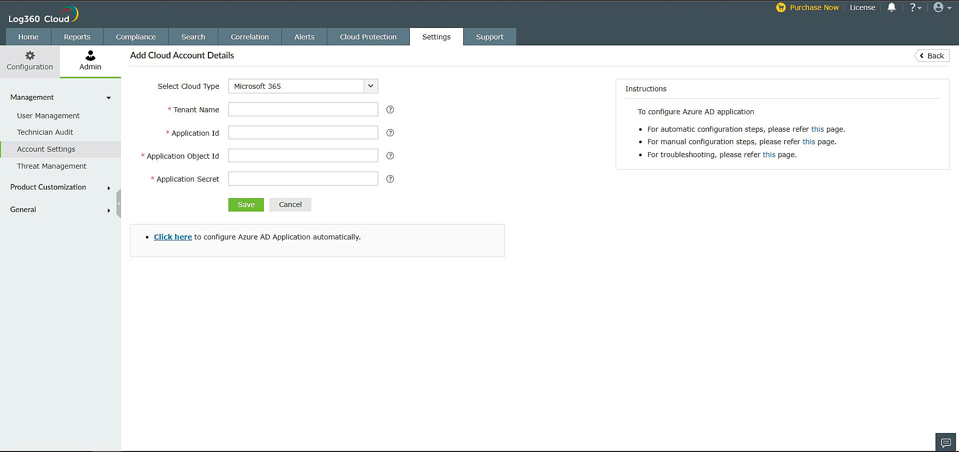 以下の手順にしたがって、Log360 CloudにMicrosoft 365 テナントを追加します。