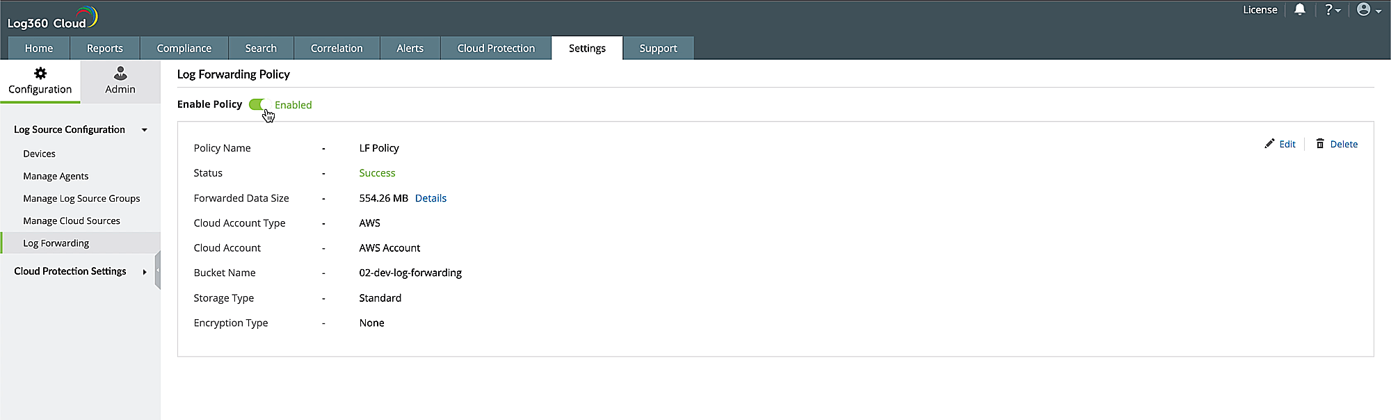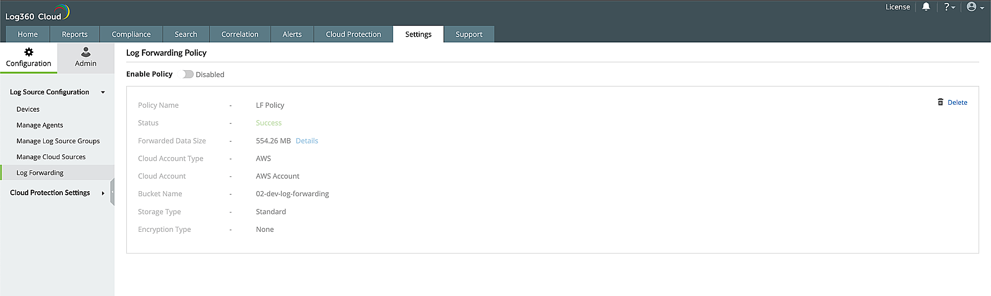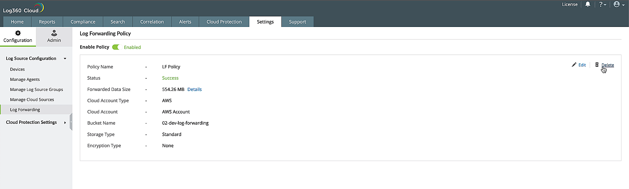 注記: 転送を無効にした期間のログは、ポリシーを有効にした後、再転送されません。