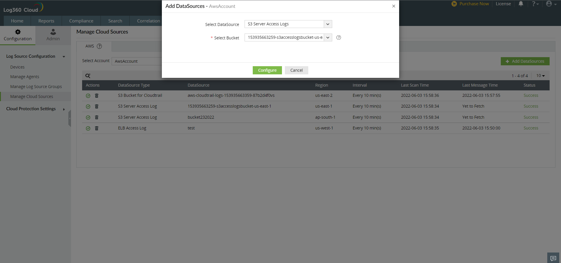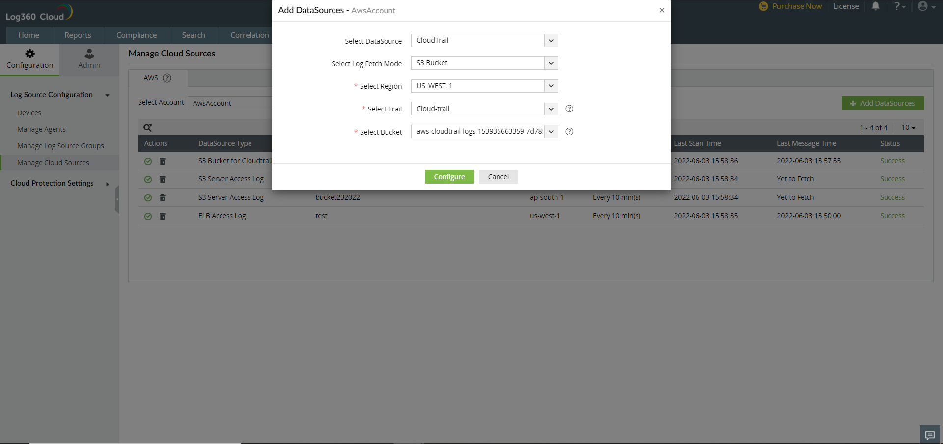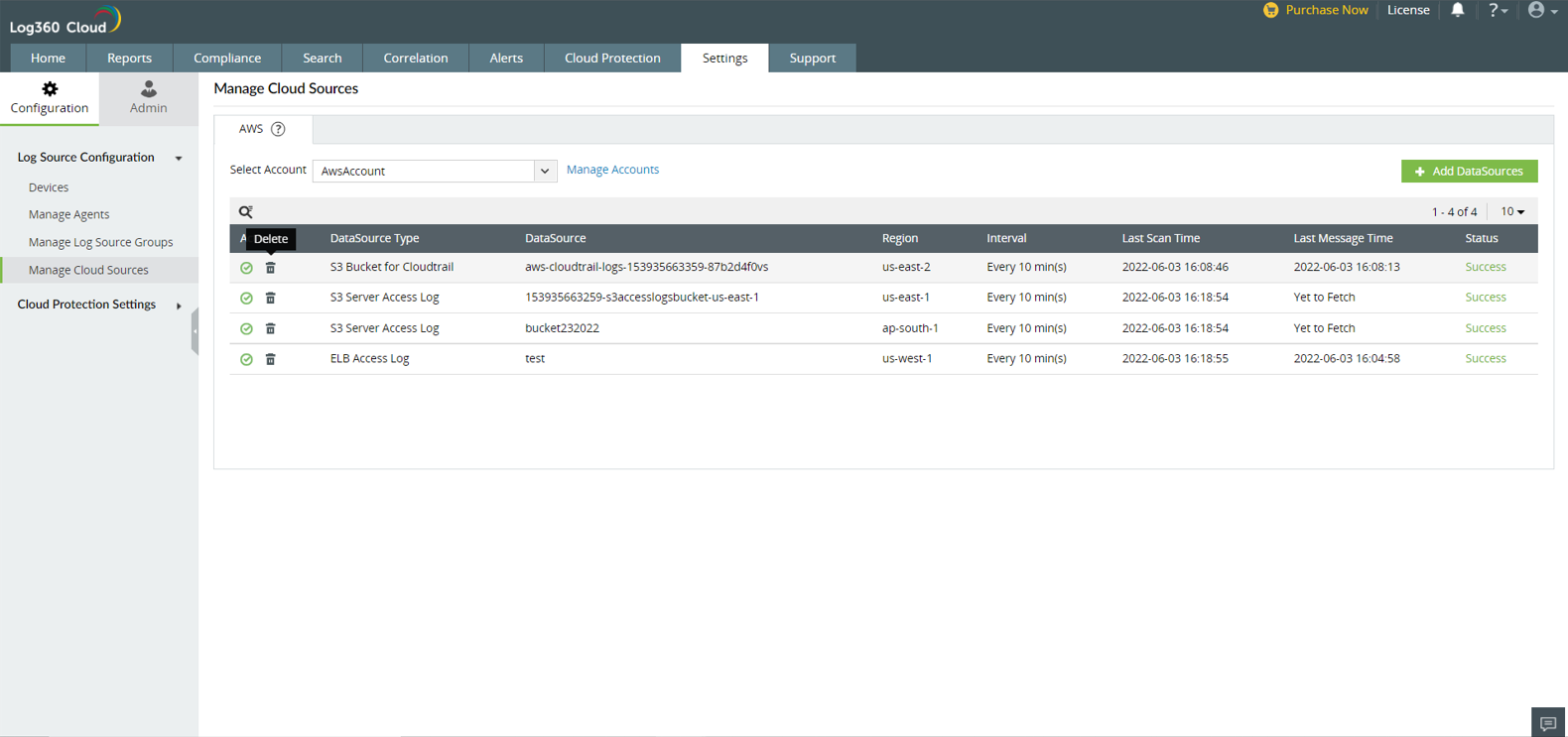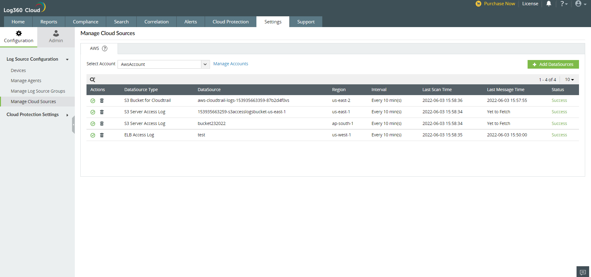 2. 作成したCloudtrailのトレイルログバケットをLog360 Cloudにデータソースとして追加
