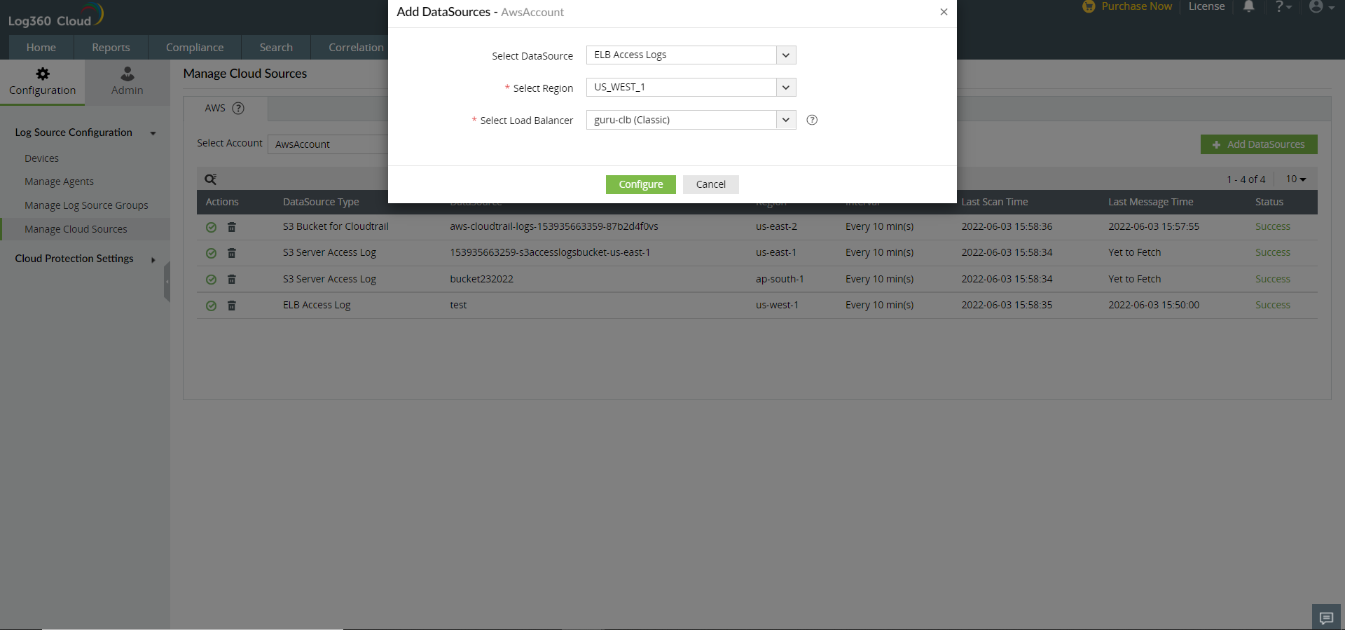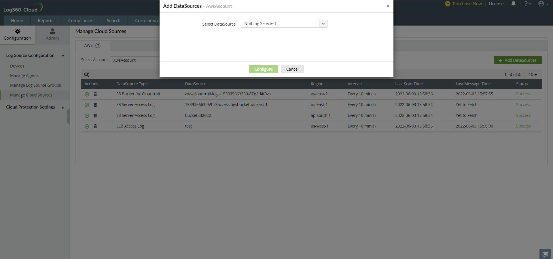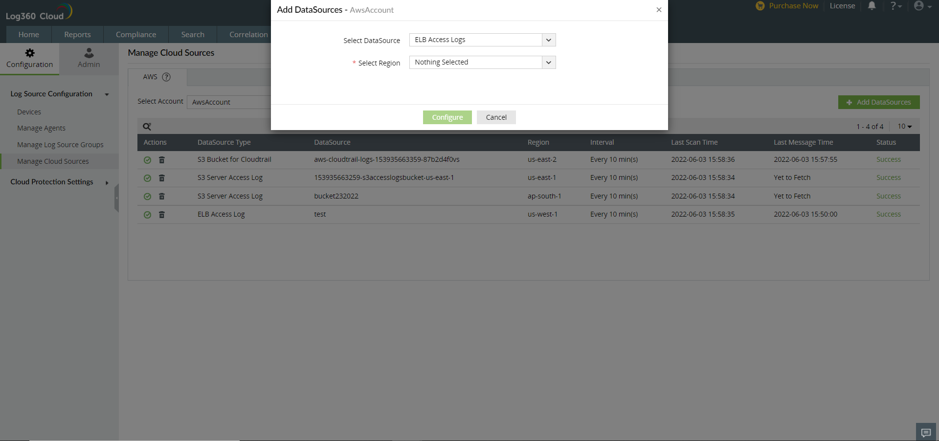 2. 作成したCloudtrailのトレイルログバケットをLog360 Cloudにデータソースとして追加