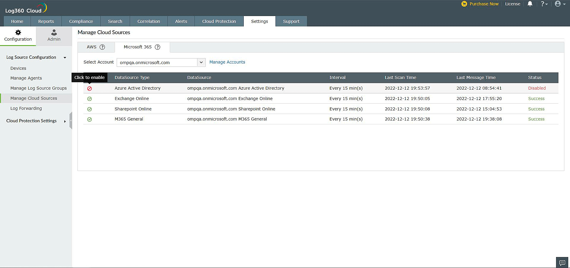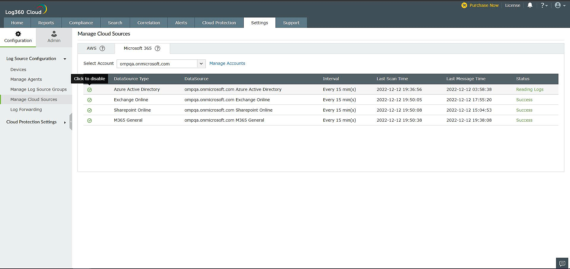 M365テナントの特定データソースを削除することはできません。Microsoft 365テナント全体をLog360 Cloudで削除することのみ可能です。個別ログソースの監視を停止するには、