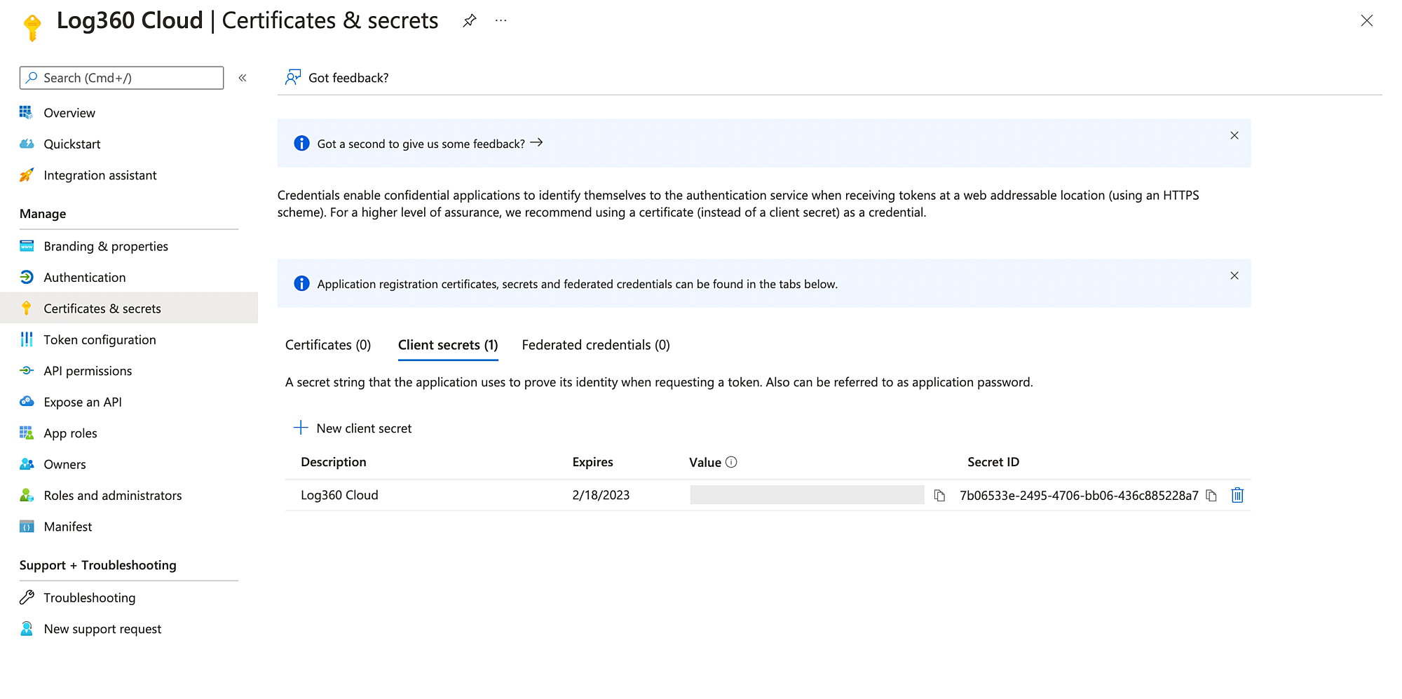 - [クライアントシークレット]セクションで、[新しいクライアントシークレット]をクリックします。