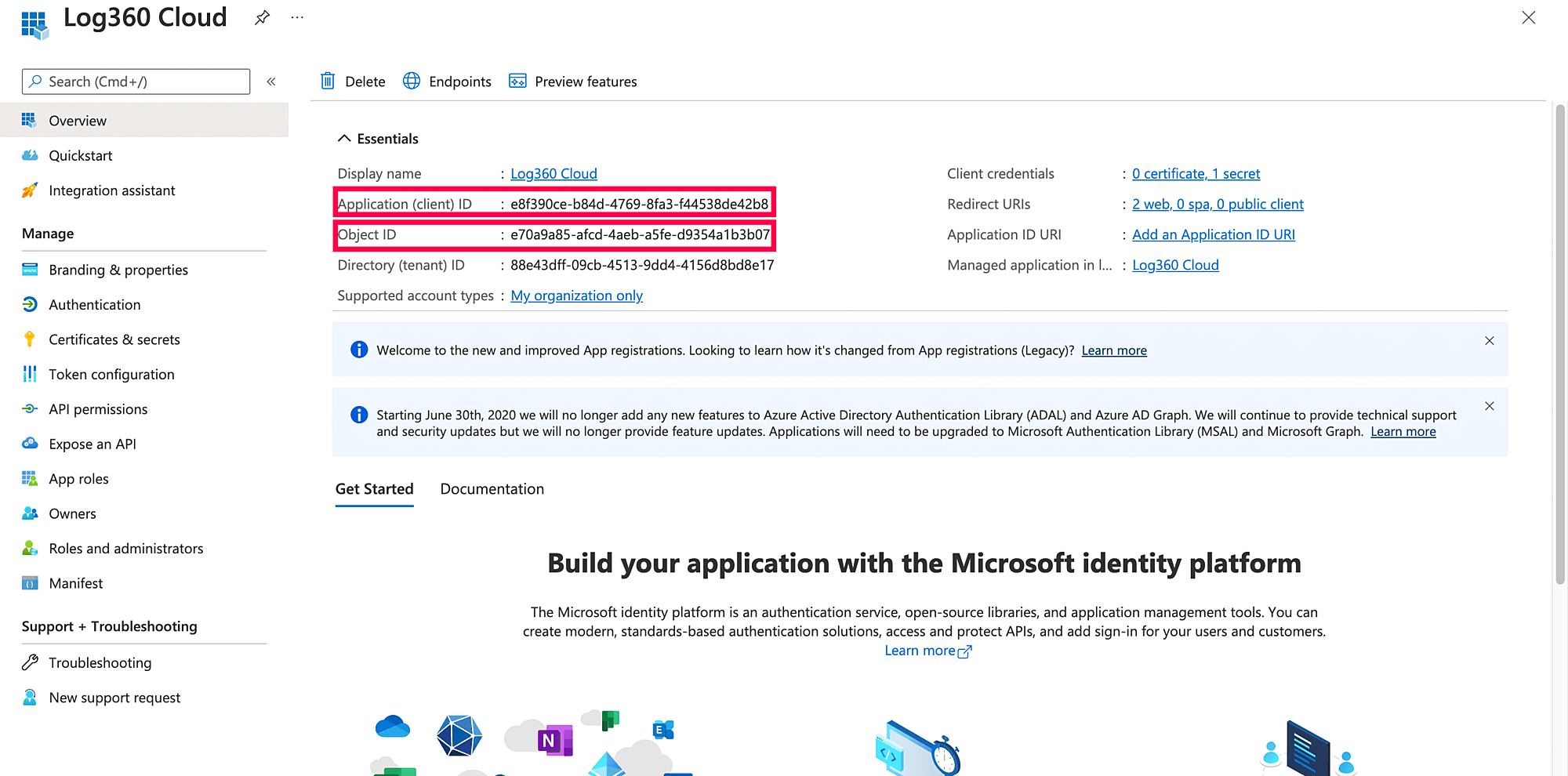 - アプリケーション(クライアント) IDとオブジェクトID値をコピーして、保存します。これらの値は、Log360 Cloudポータルでテナントを構成する際に必要です。