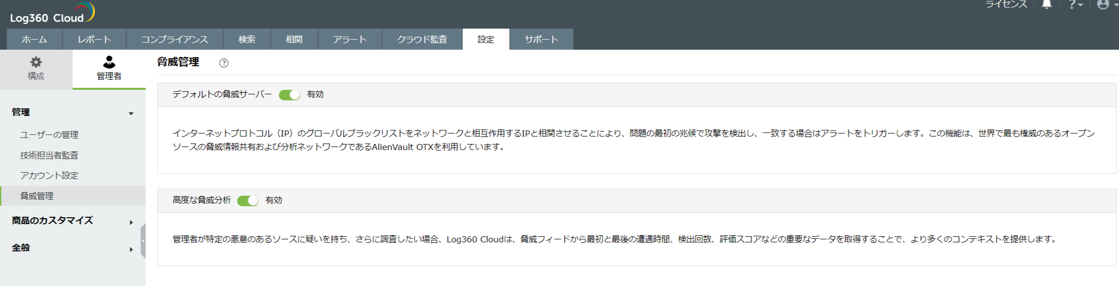 - Log360 Cloudにログインし、[設定]→[管理者]→[管理]→[脅威管理]の順に移動します。